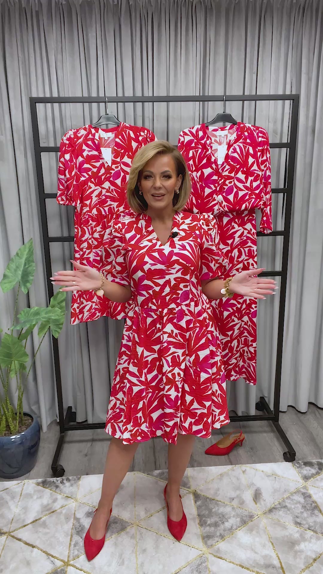 - Mönstrad i röda och rosa toner på vit botten.