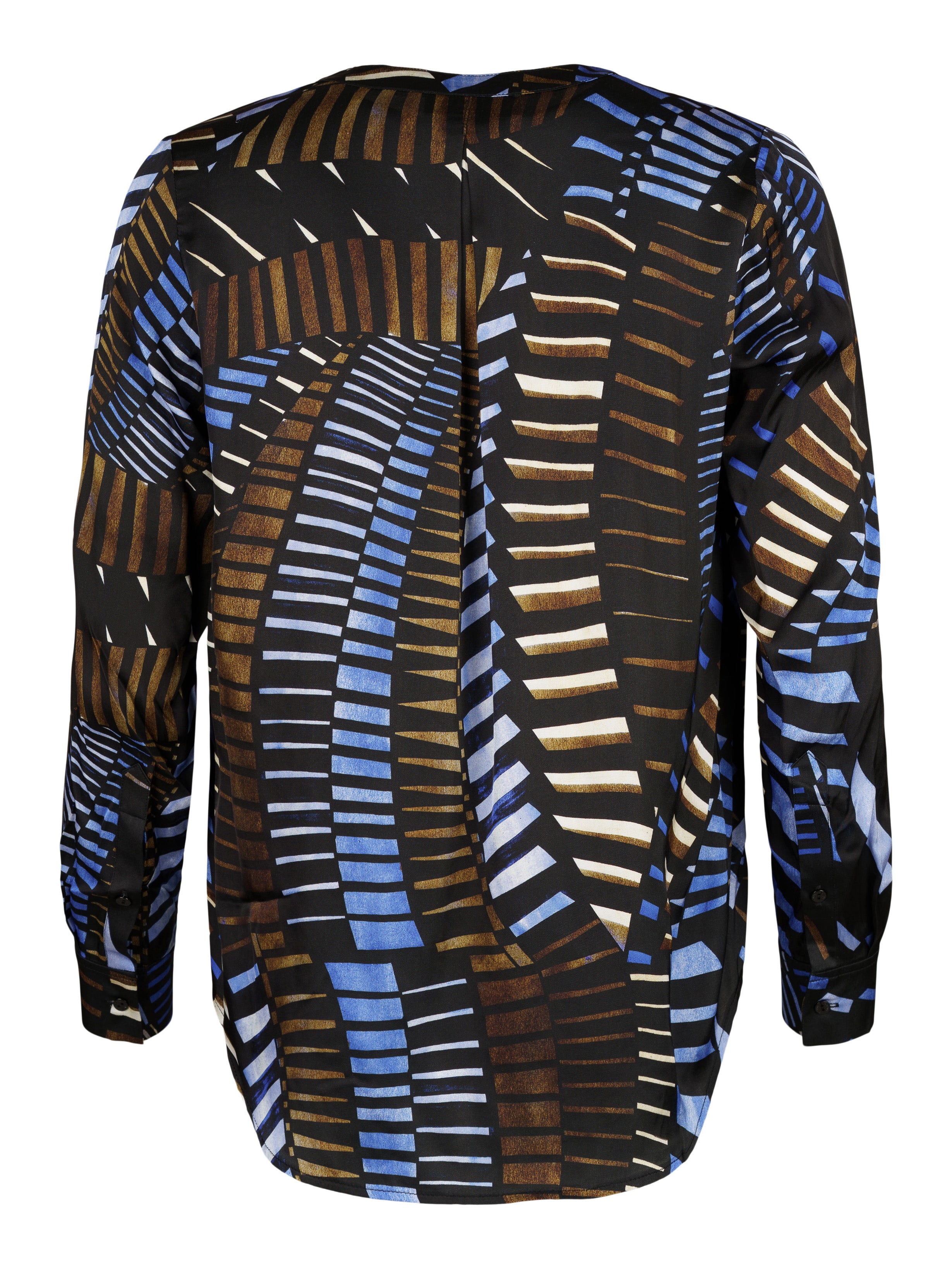 - Grafiskt mönstrad i beiga, bruna svarta och blåa toner.