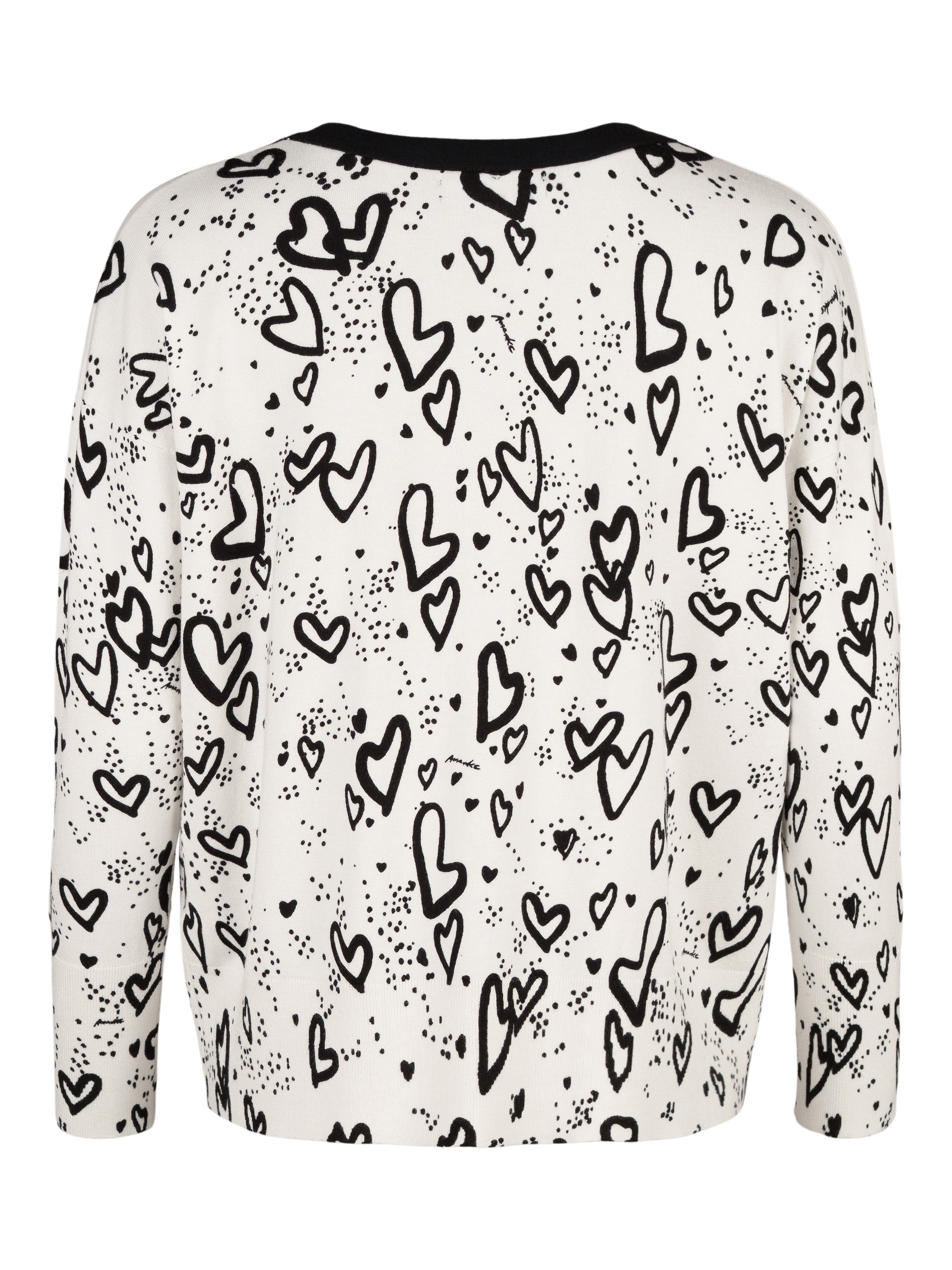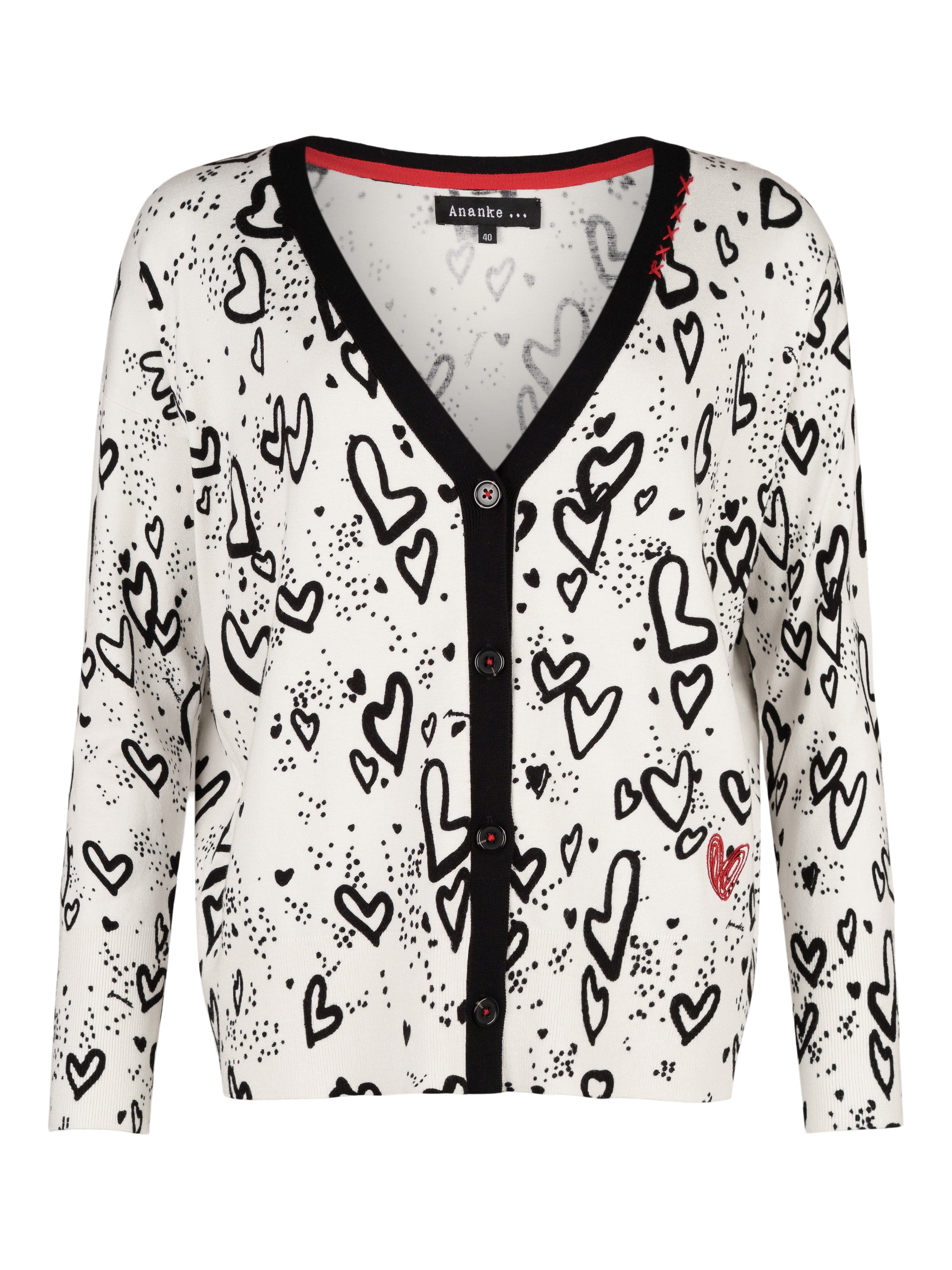 - Finstickad kofta i svart och vitt mönster med röda inslag.