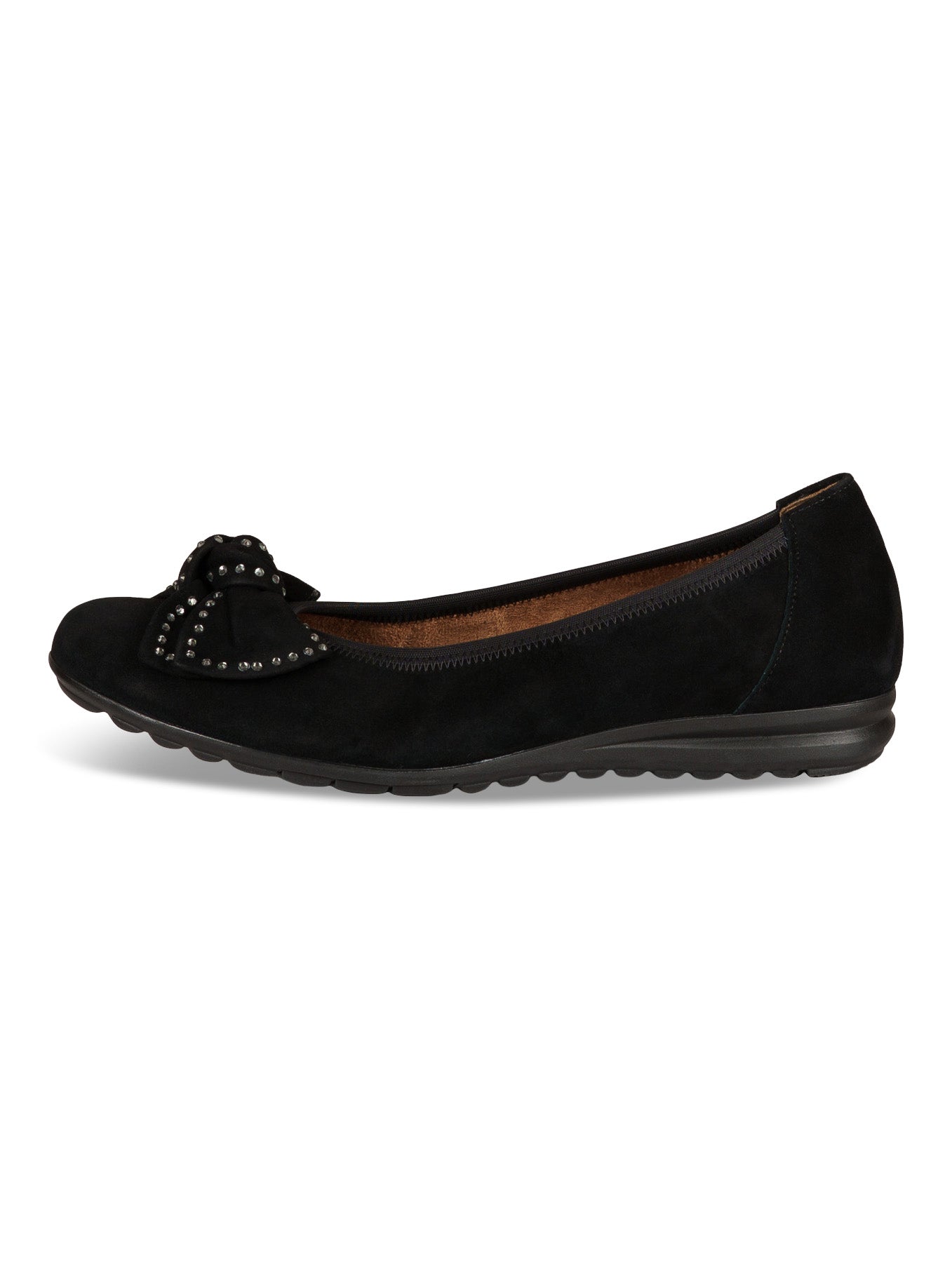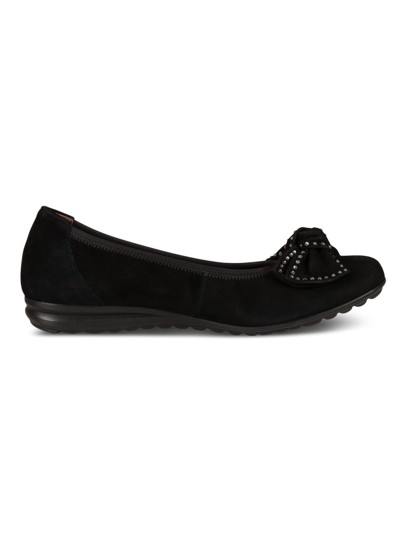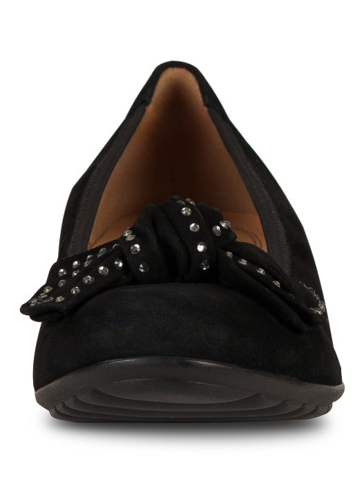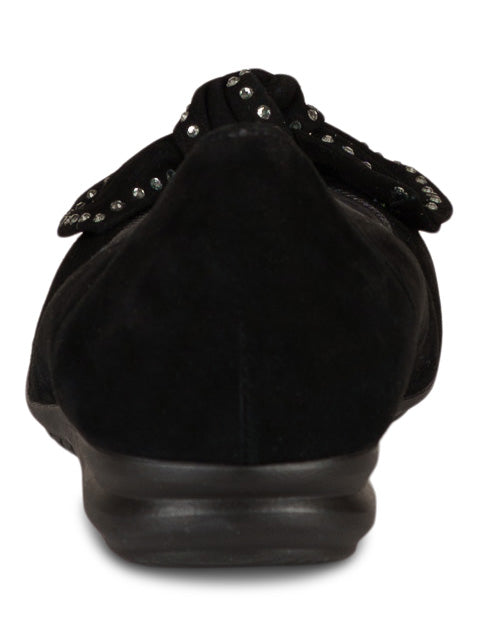 - Mockaskor dekorerad med rosett och strasstenar framtill.