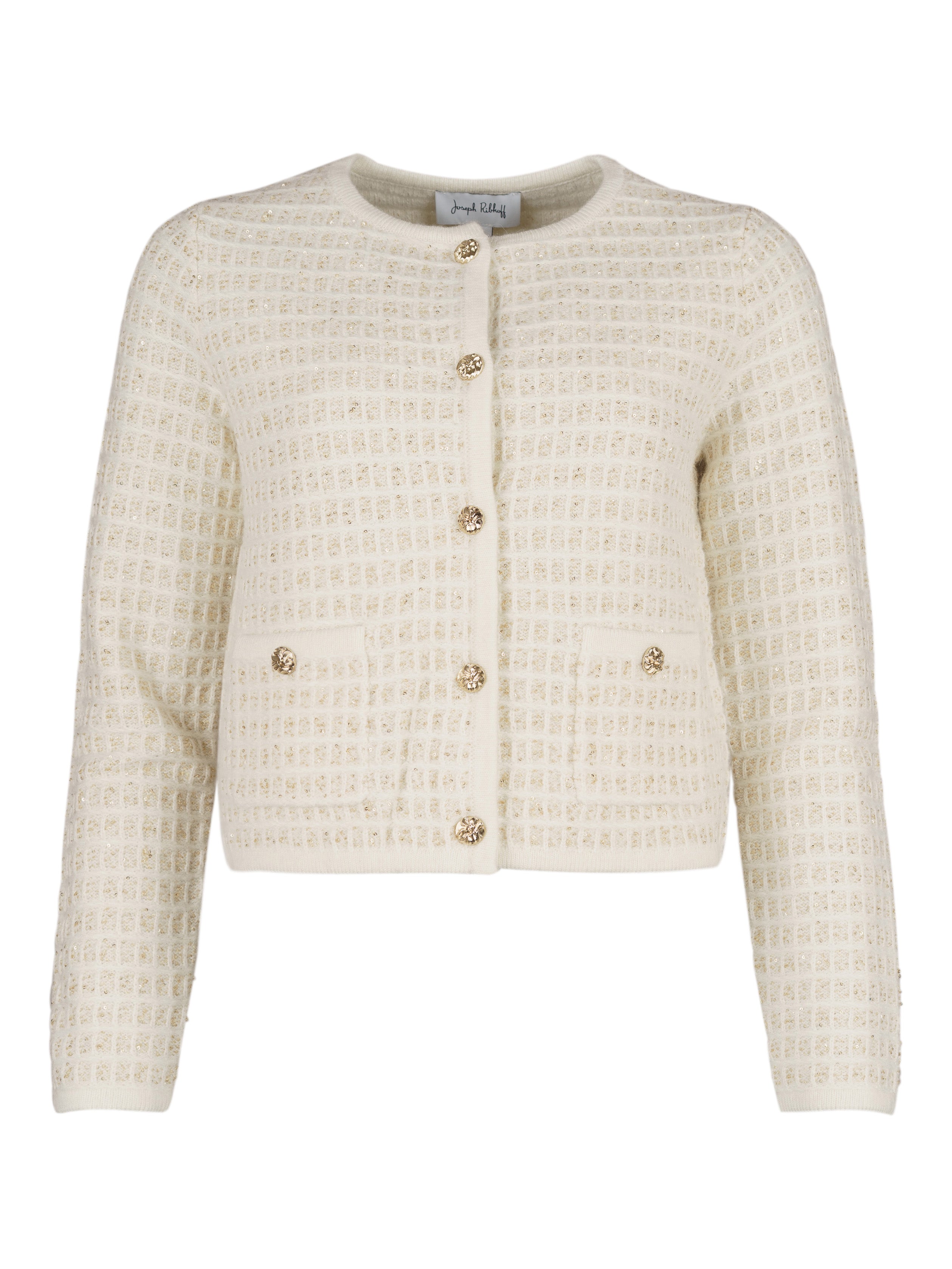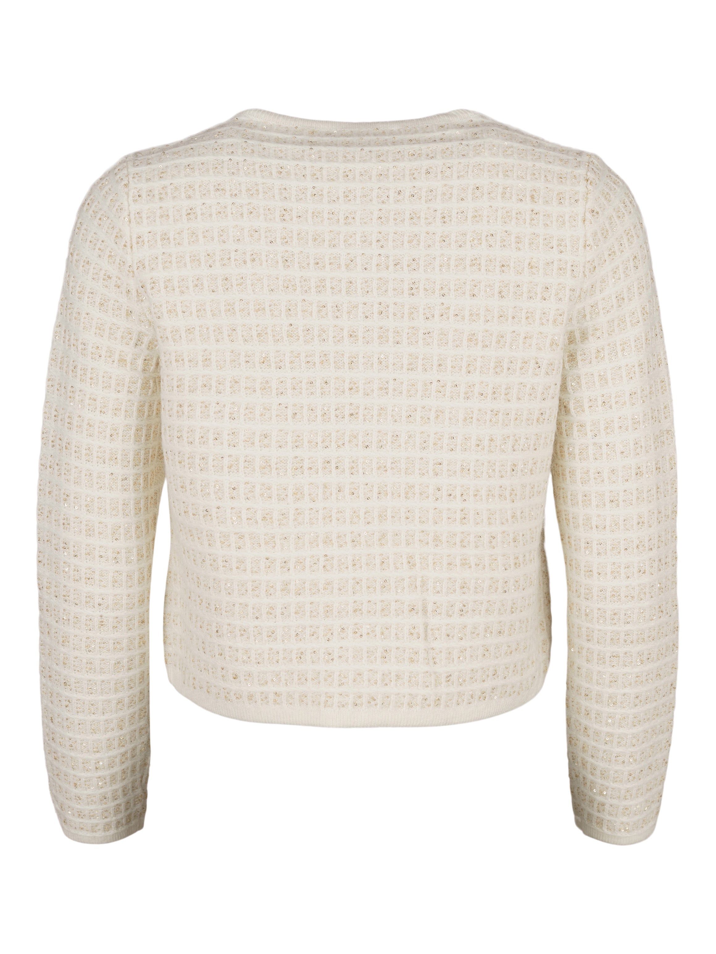 - Mönsterstickad kofta med invävda guldfärgade paljetter.