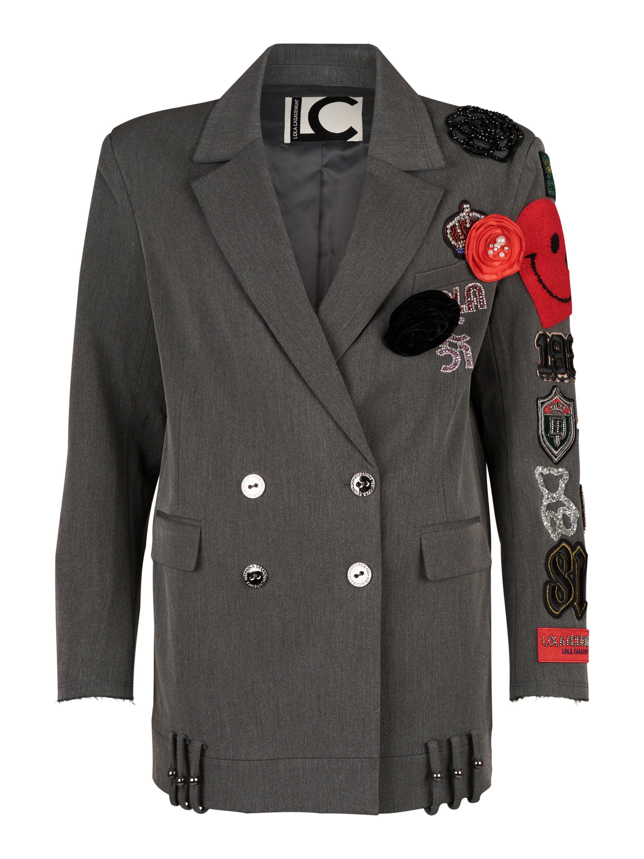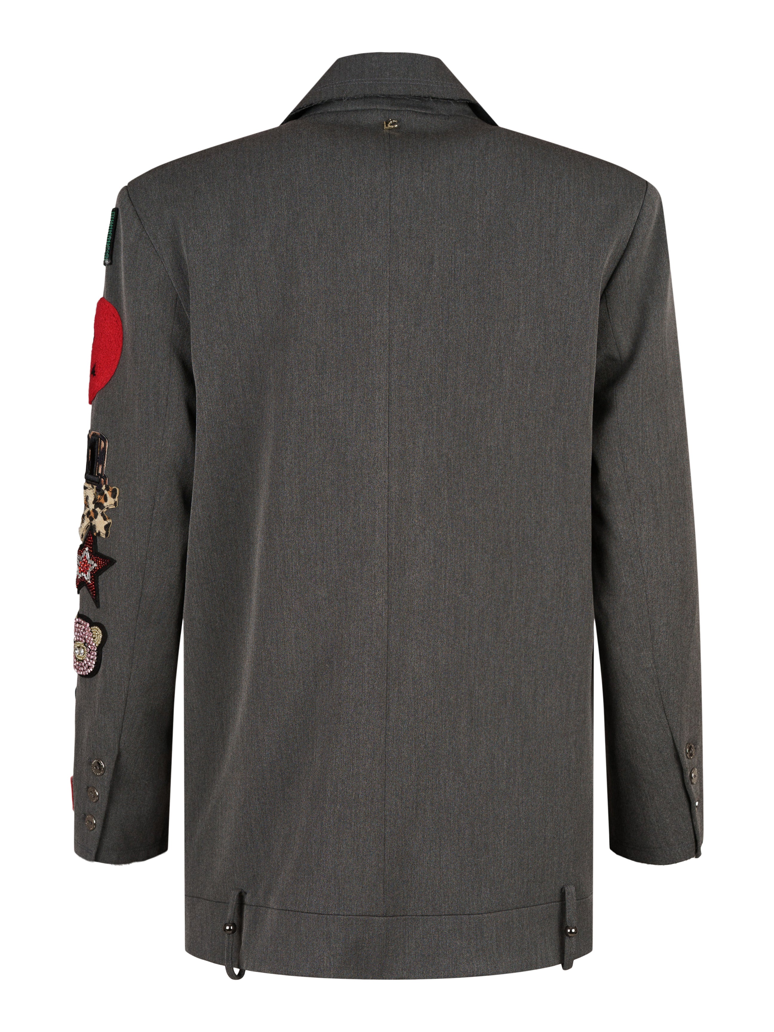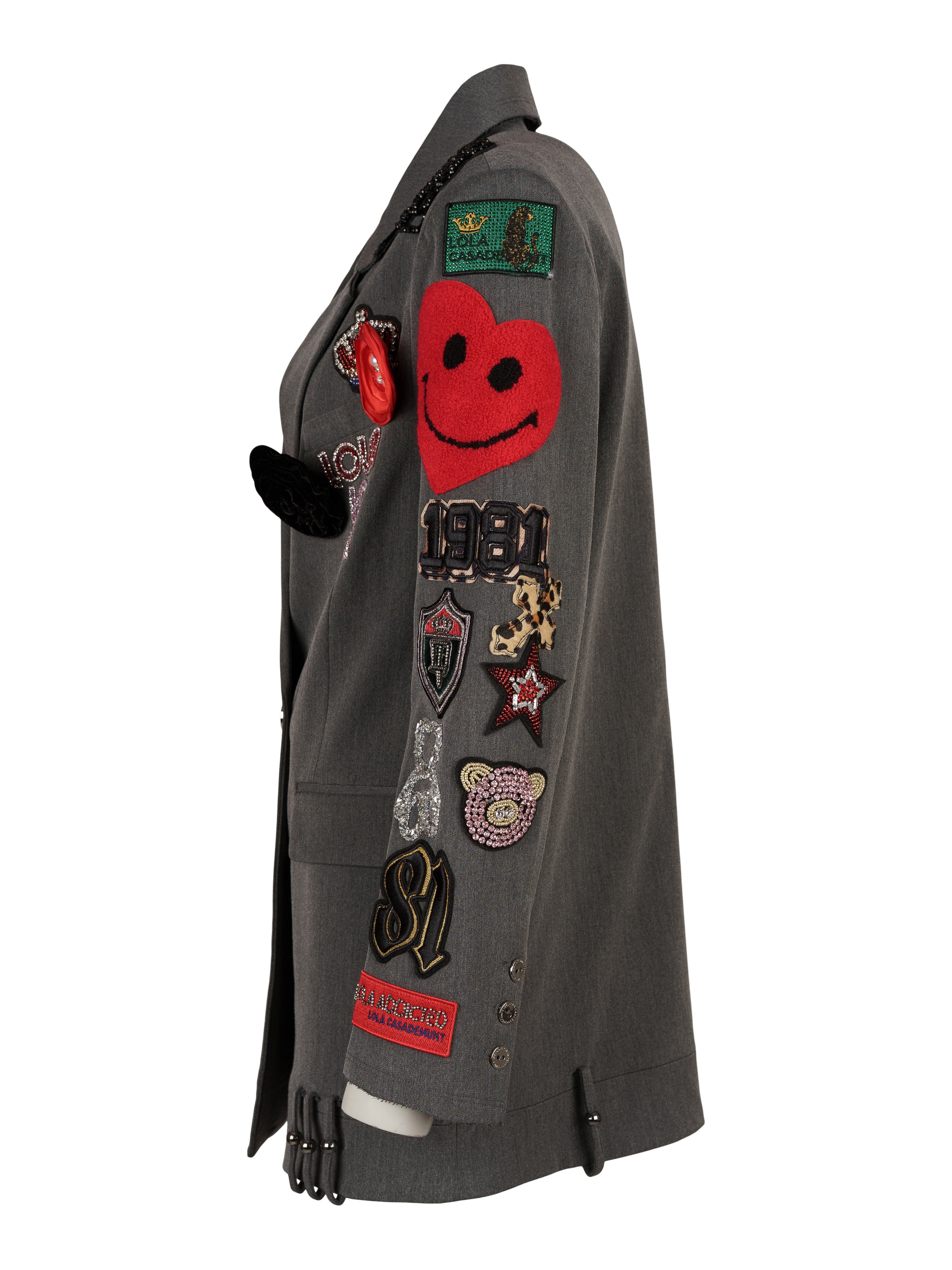 - Ena ärmen fullt dekorerad med sydda emblemer med strasstenar.
