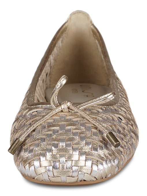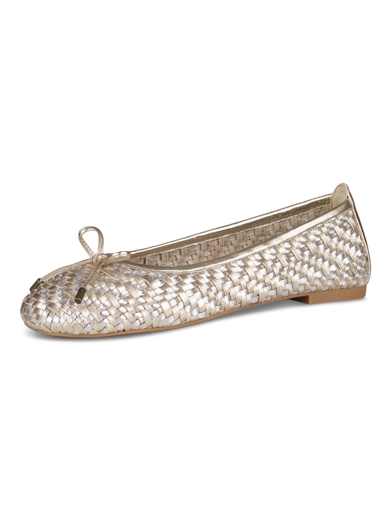 - Flätat skinn i silver och guldfärgad metallic.