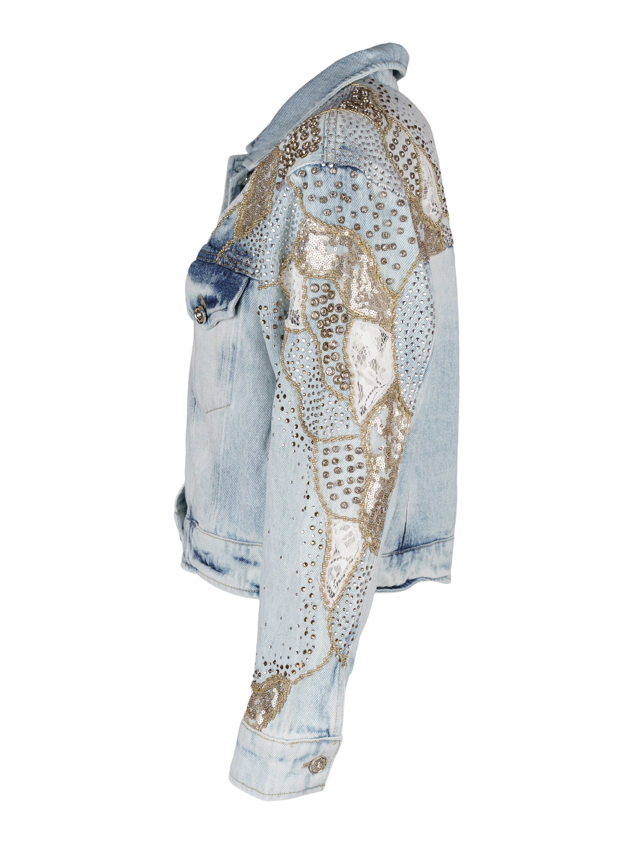 - Dekorerad med guldfärgade strasstenar, paljetter, pärlor och spetsdetaljer.