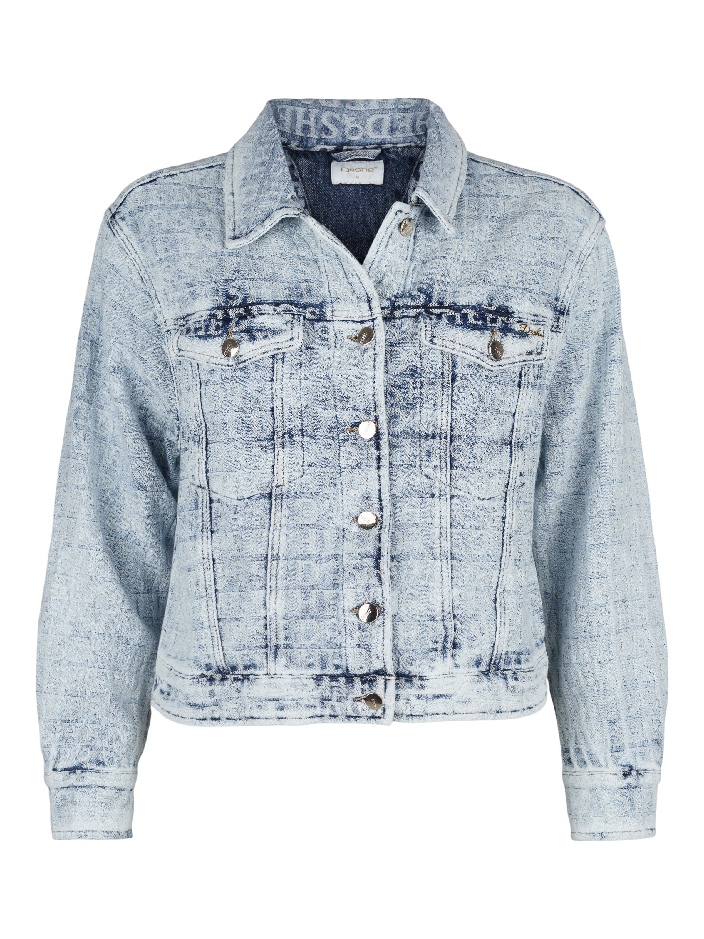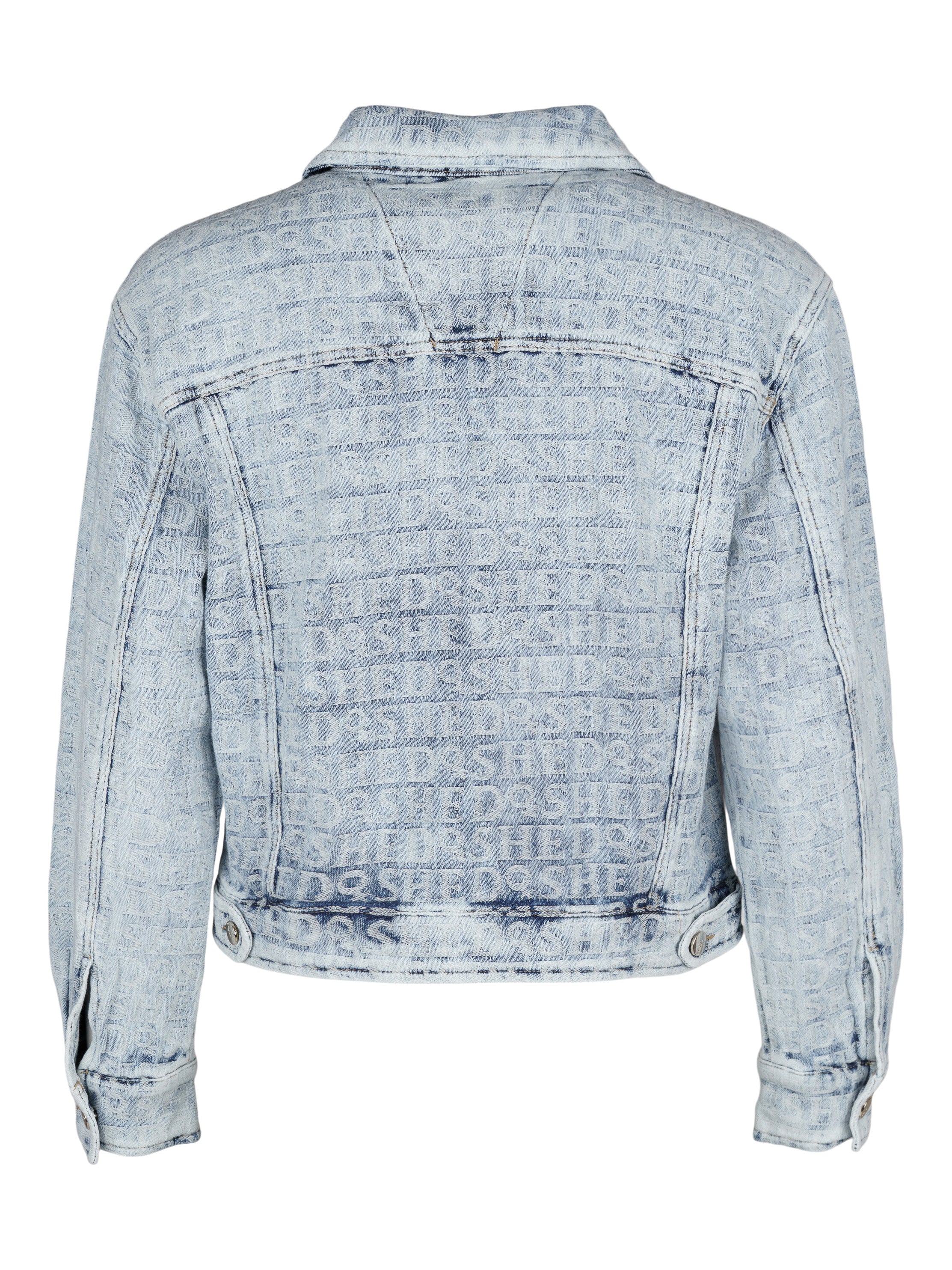 - Mjuk jeansjacka med invävd text i tyget och sömnadsdetaljer.