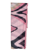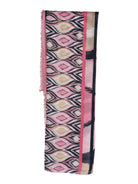 - Mönstrad i rosa, mörkblå och beiga toner med inslag av vitt.