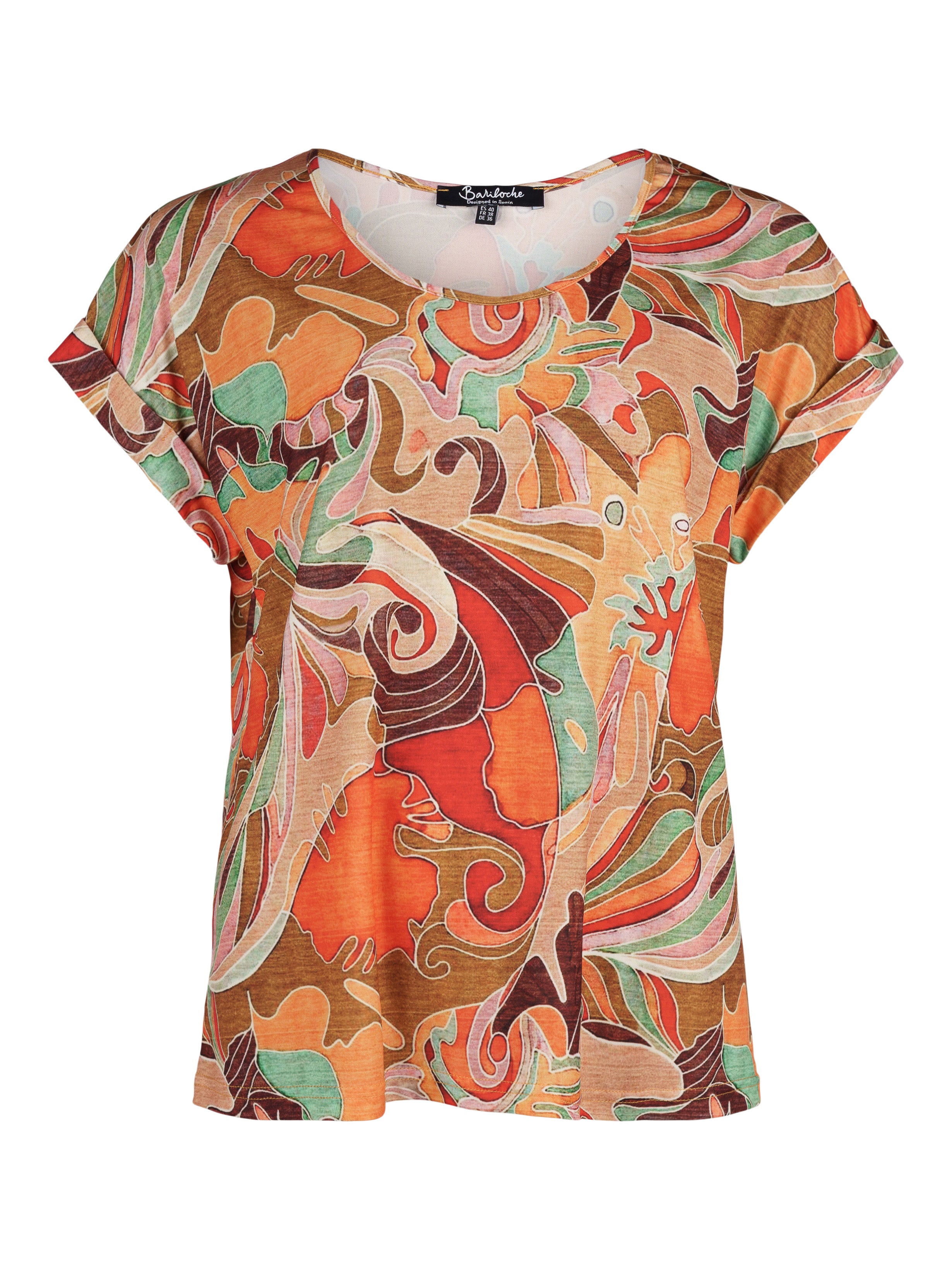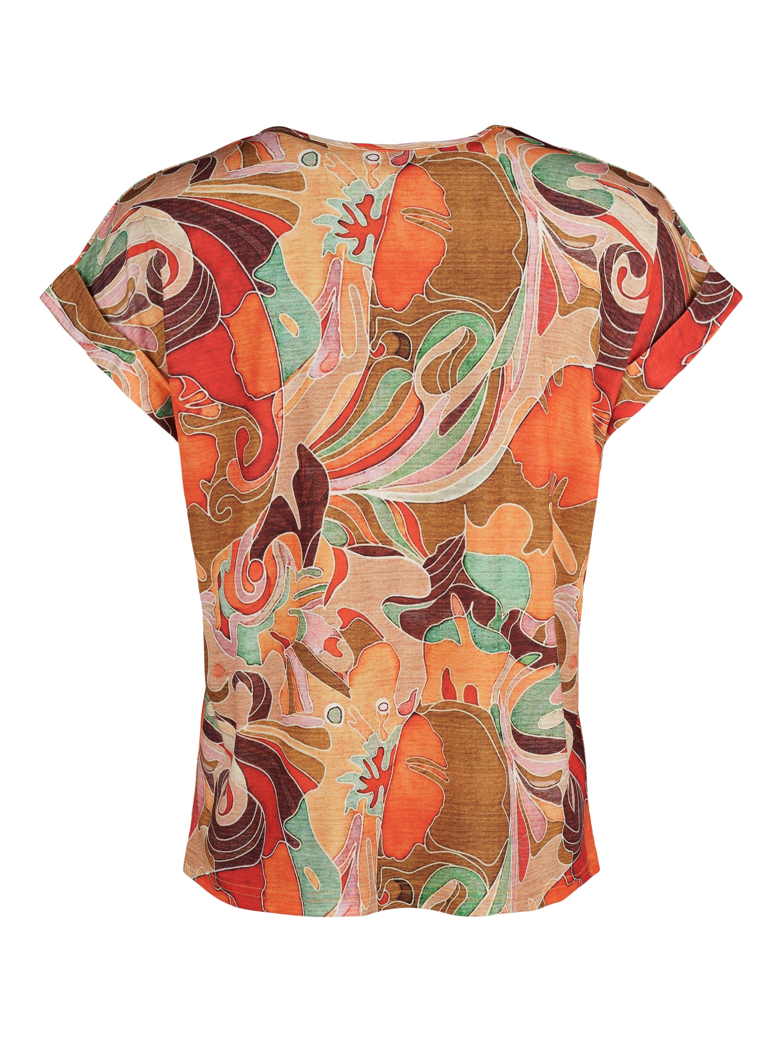- Mönstrad i orangea och gröna toner.