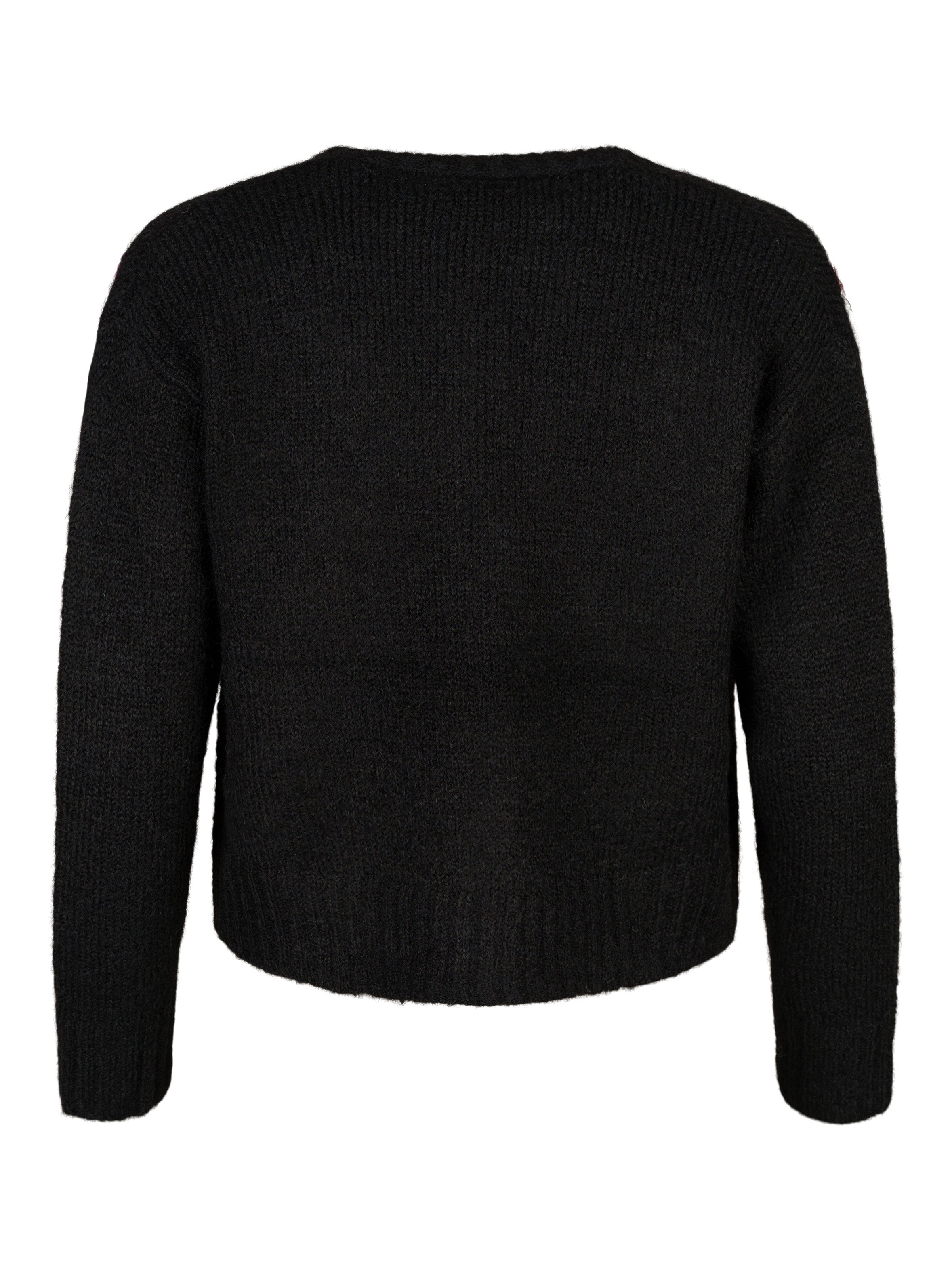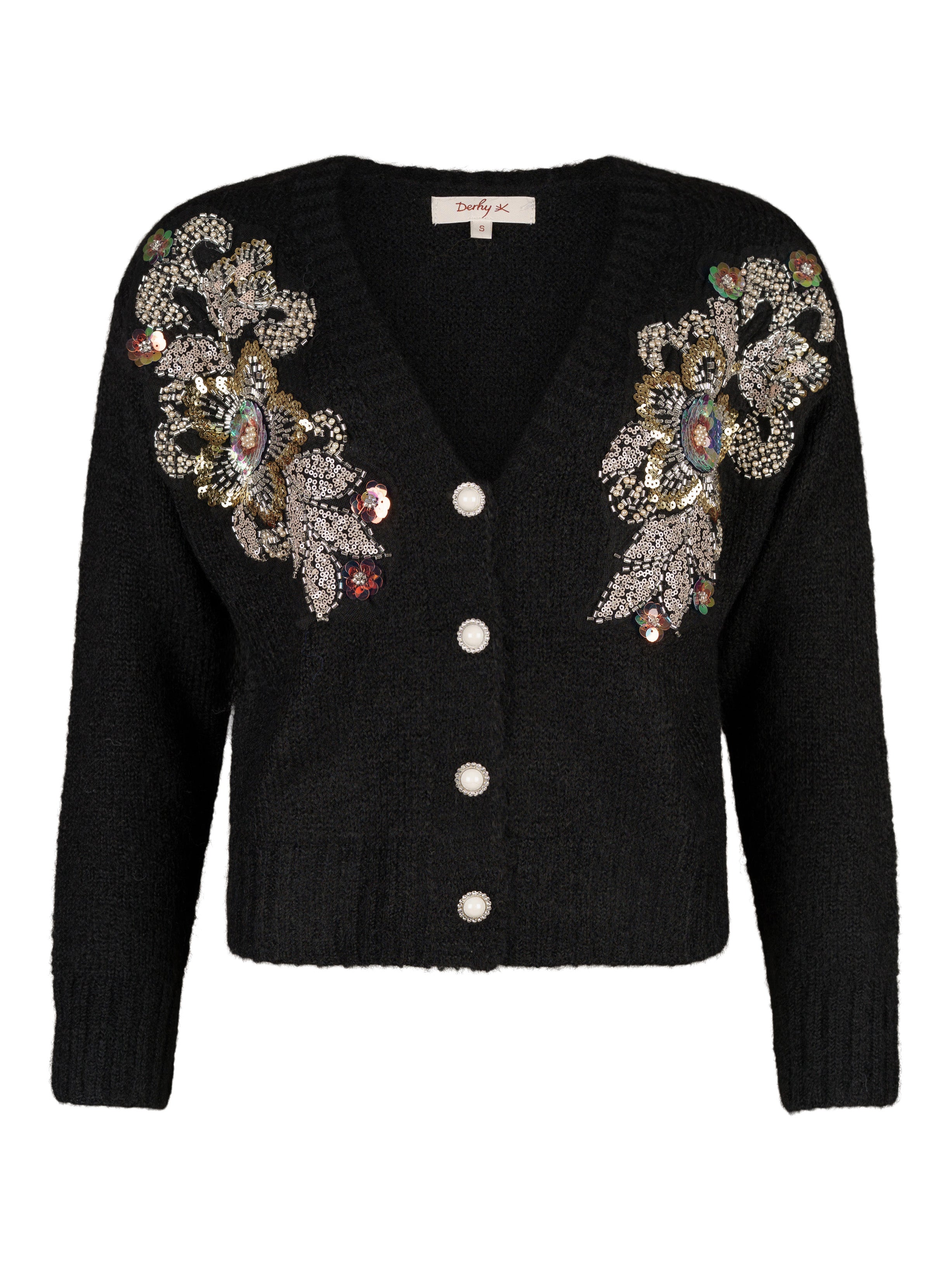 - Stickad kofta dekorerad med paljetter och pärlor framtill.
