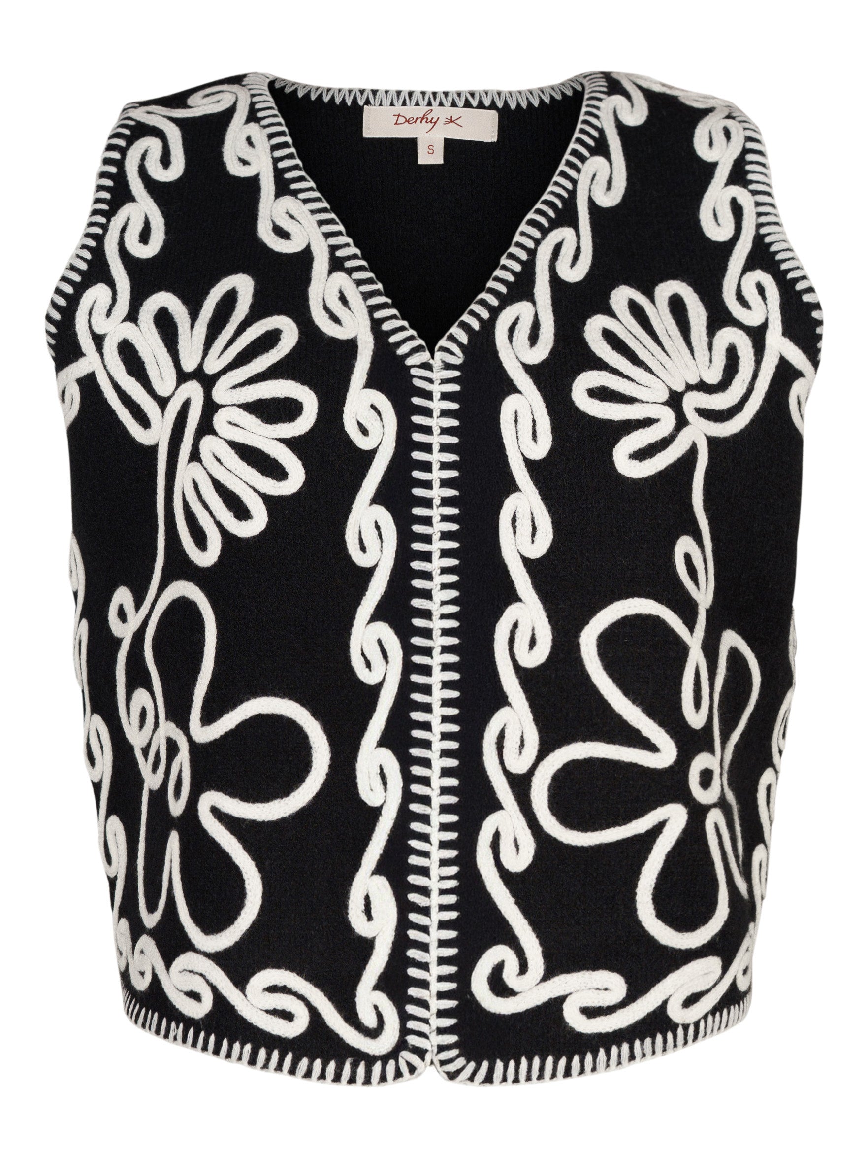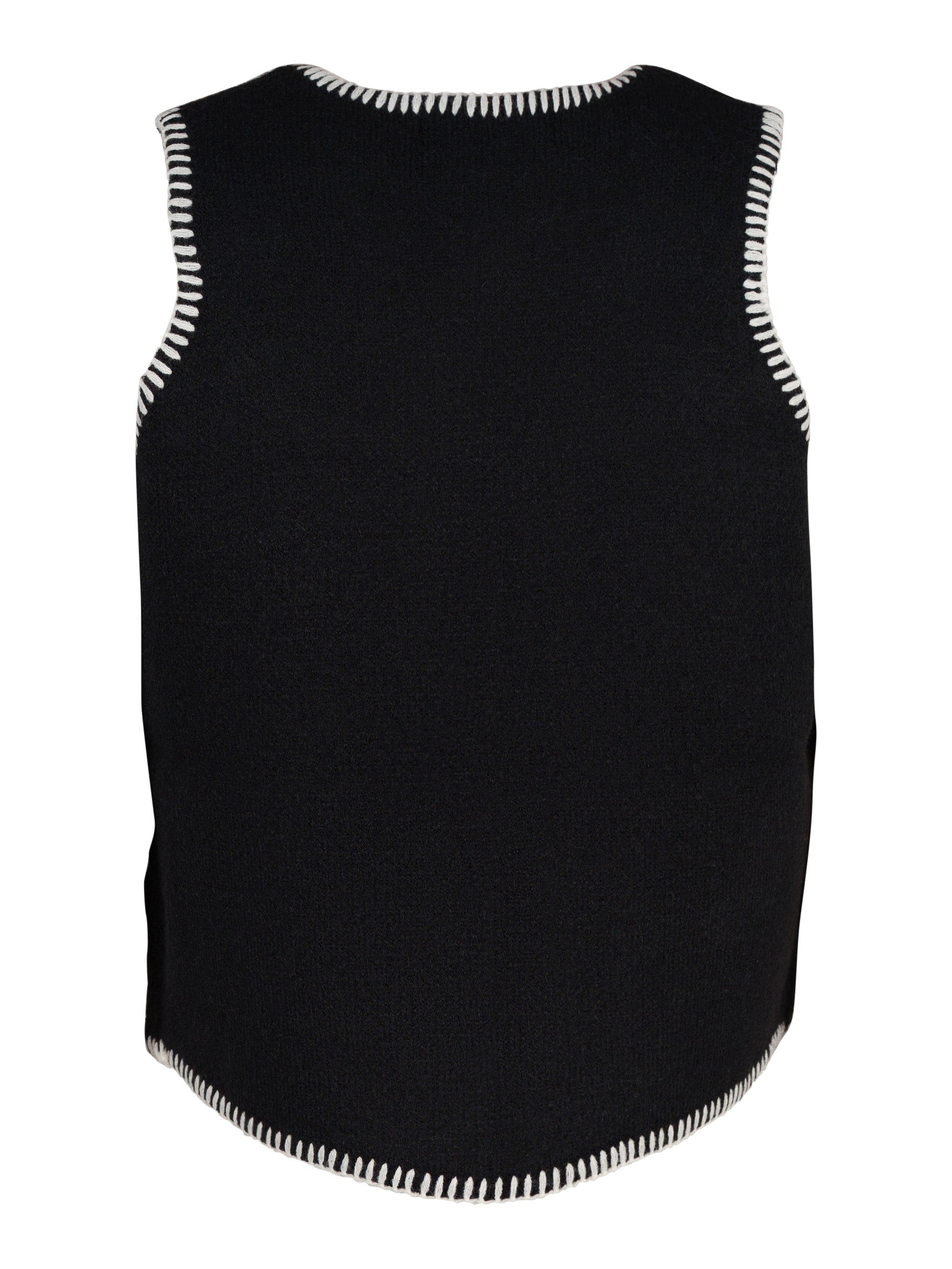 - Stickad väst, dekorerad med utanpåliggande virkningar.