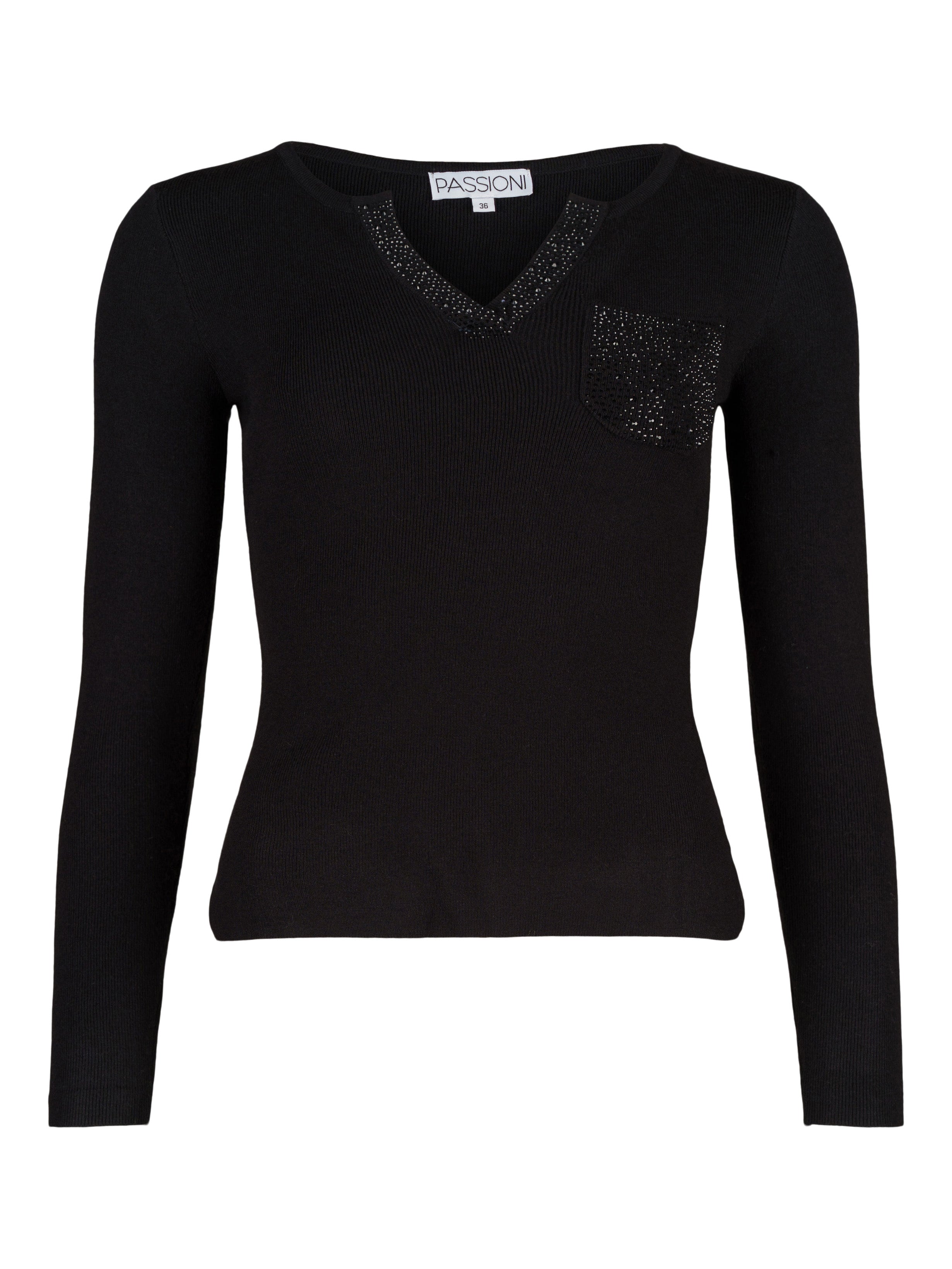 - Dekorerad med svarta strasstenar i halsringningen.
