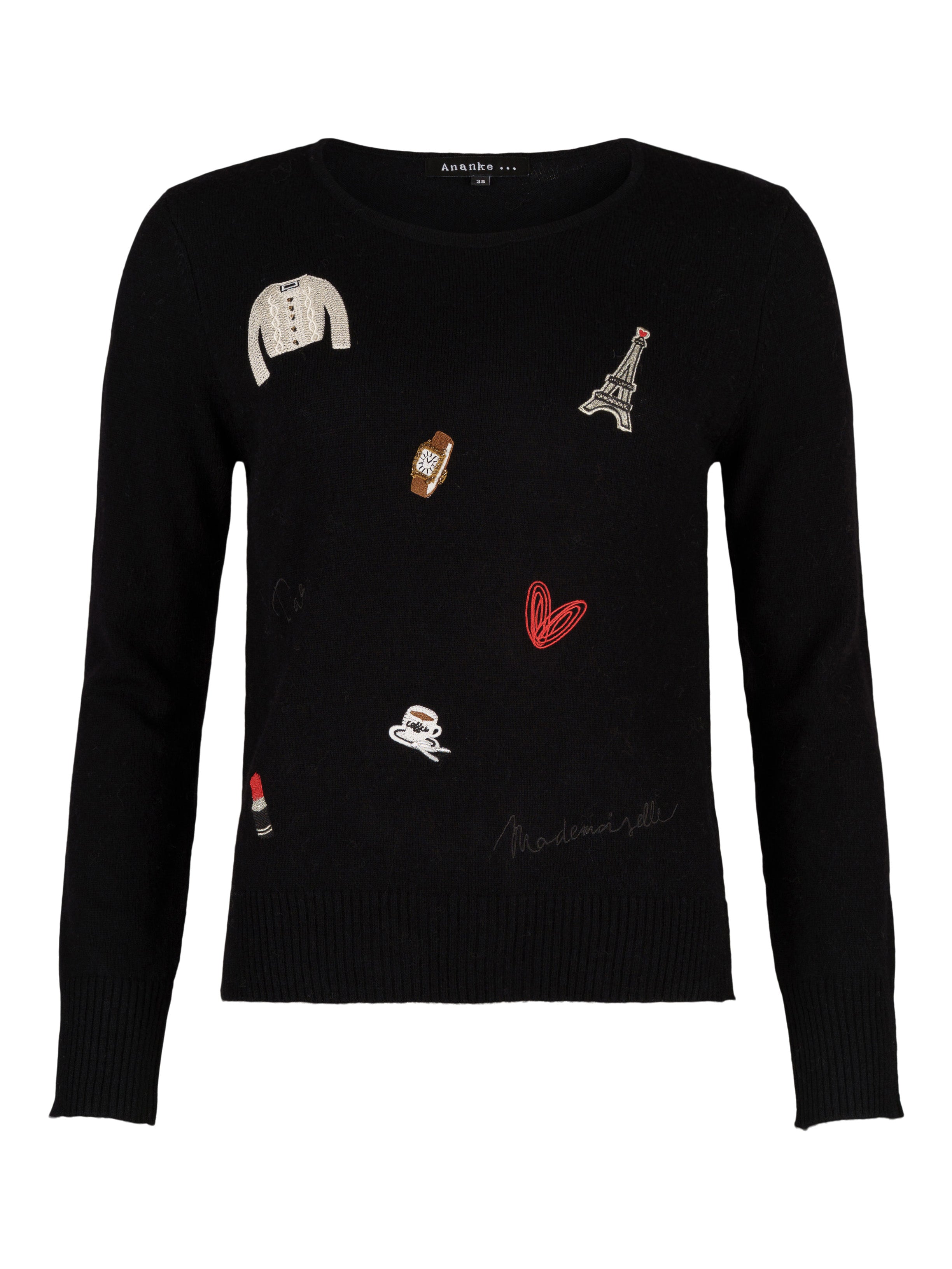 - Finstickad tröja, dekorerad med broderade emblem framtill med glittertråd och pärlor.