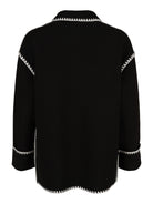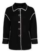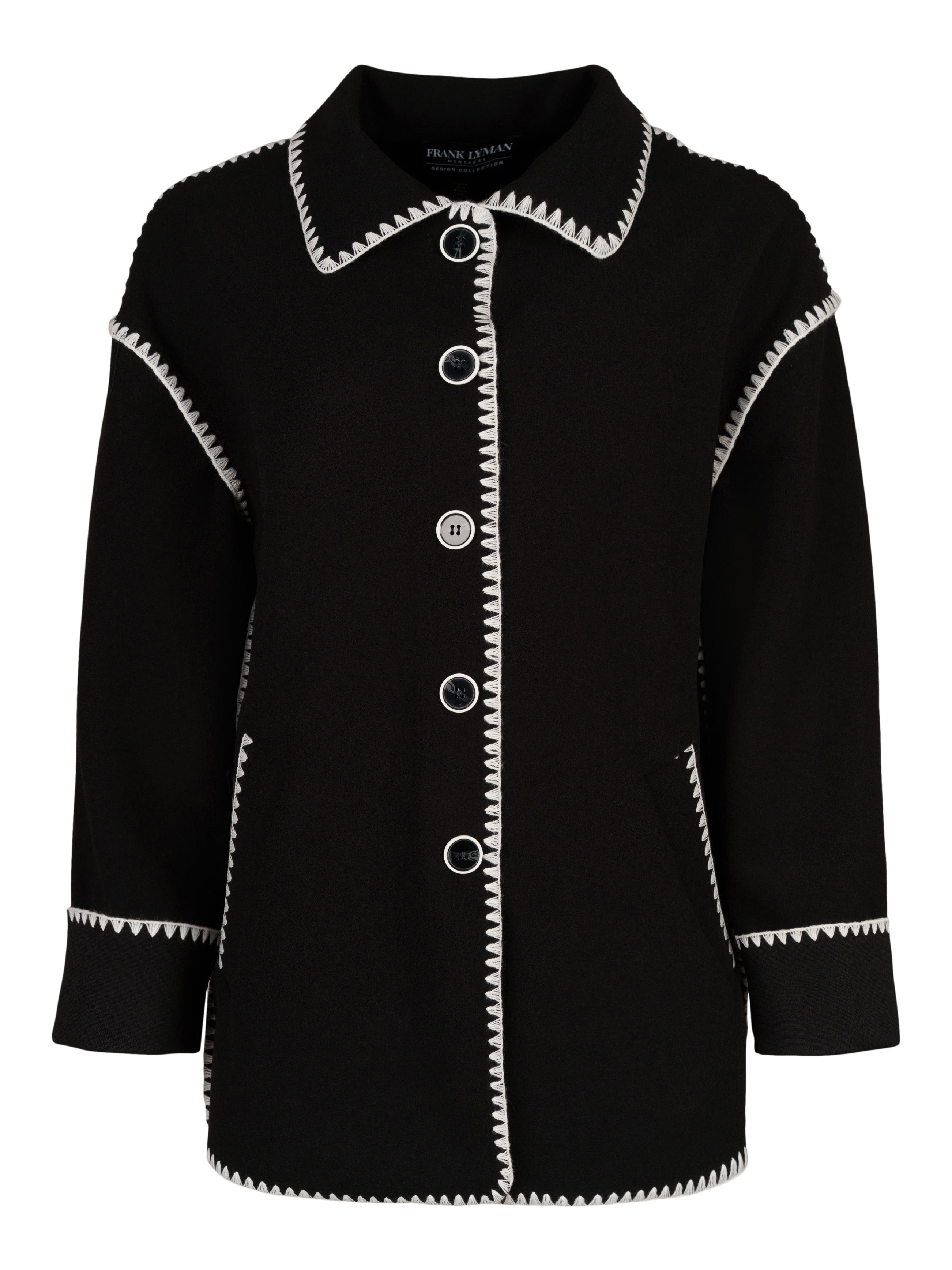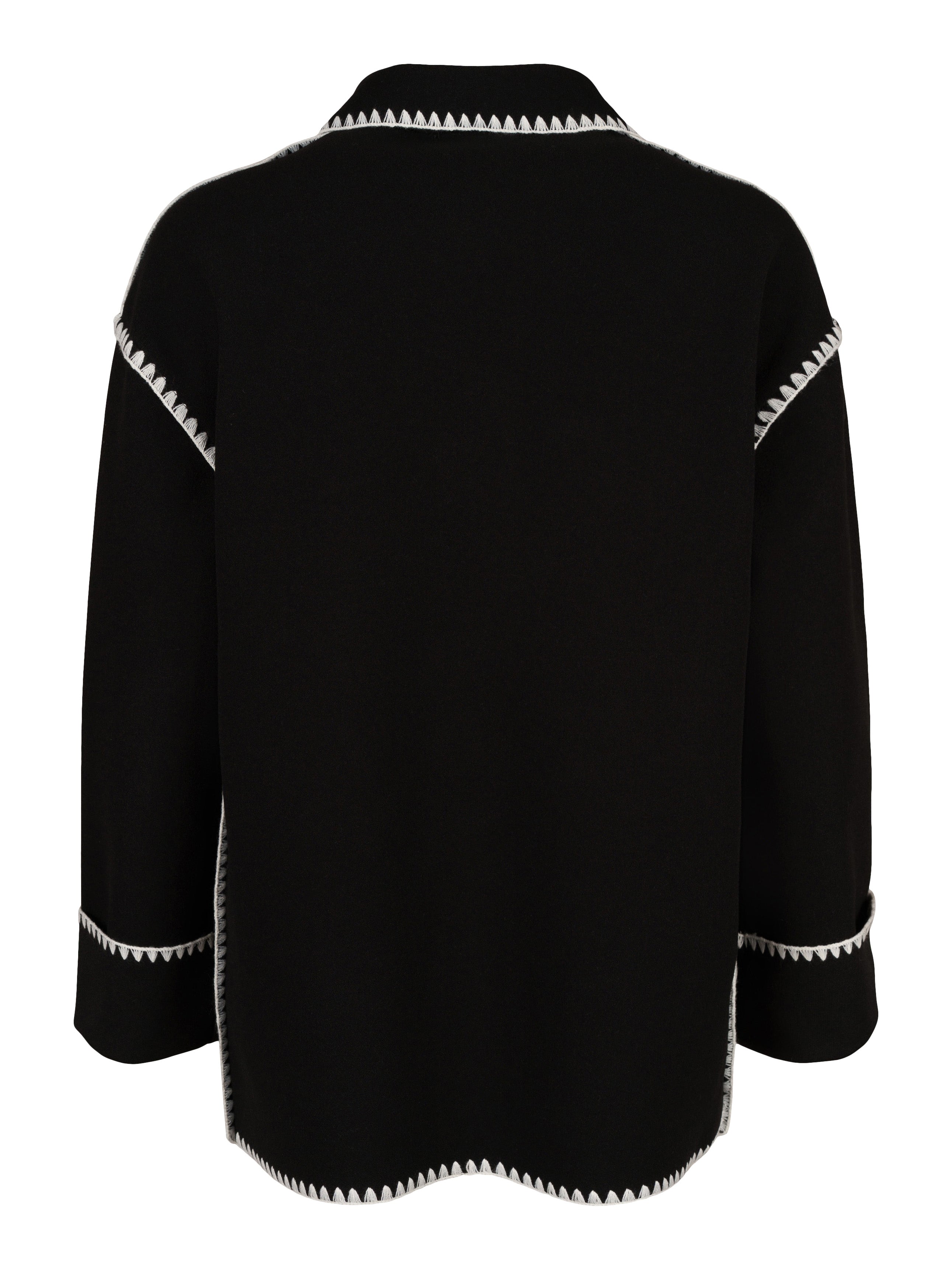 - Mjuk jacka dekorerad med vit brodyr som ramar in.