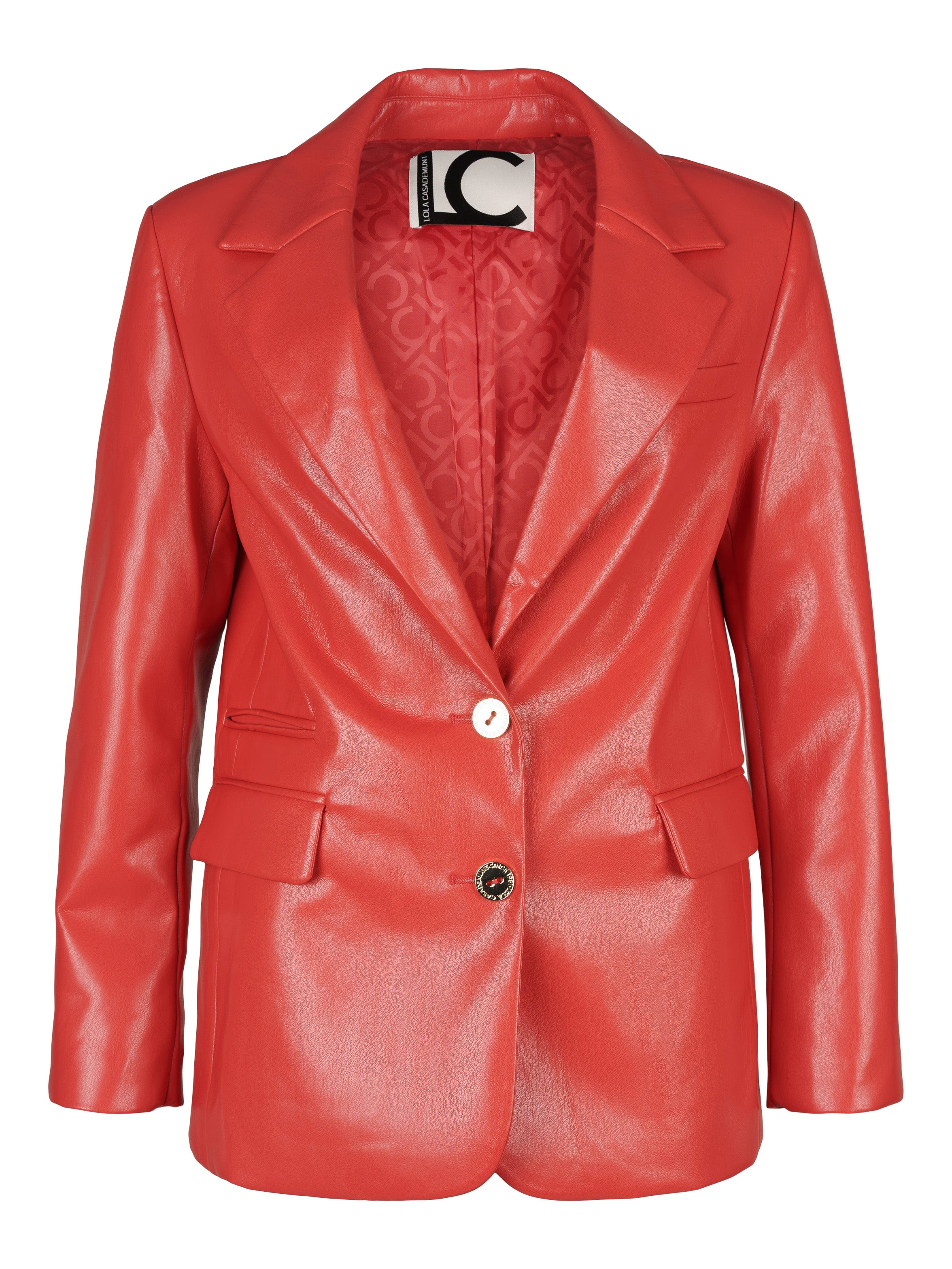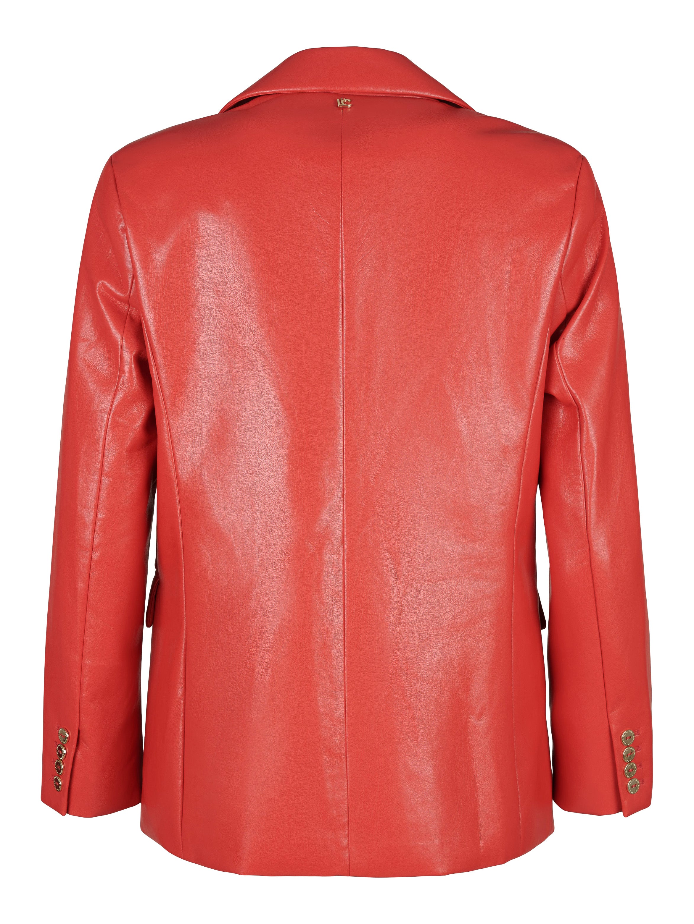 - Röd kavaj i mjuk skinnimitation med sömnadsdetaljer.