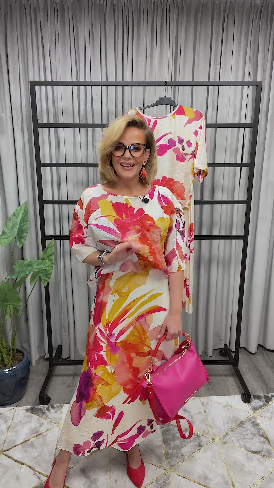 - Mönstrad i orangea, lila toner på ljusbeige botten.