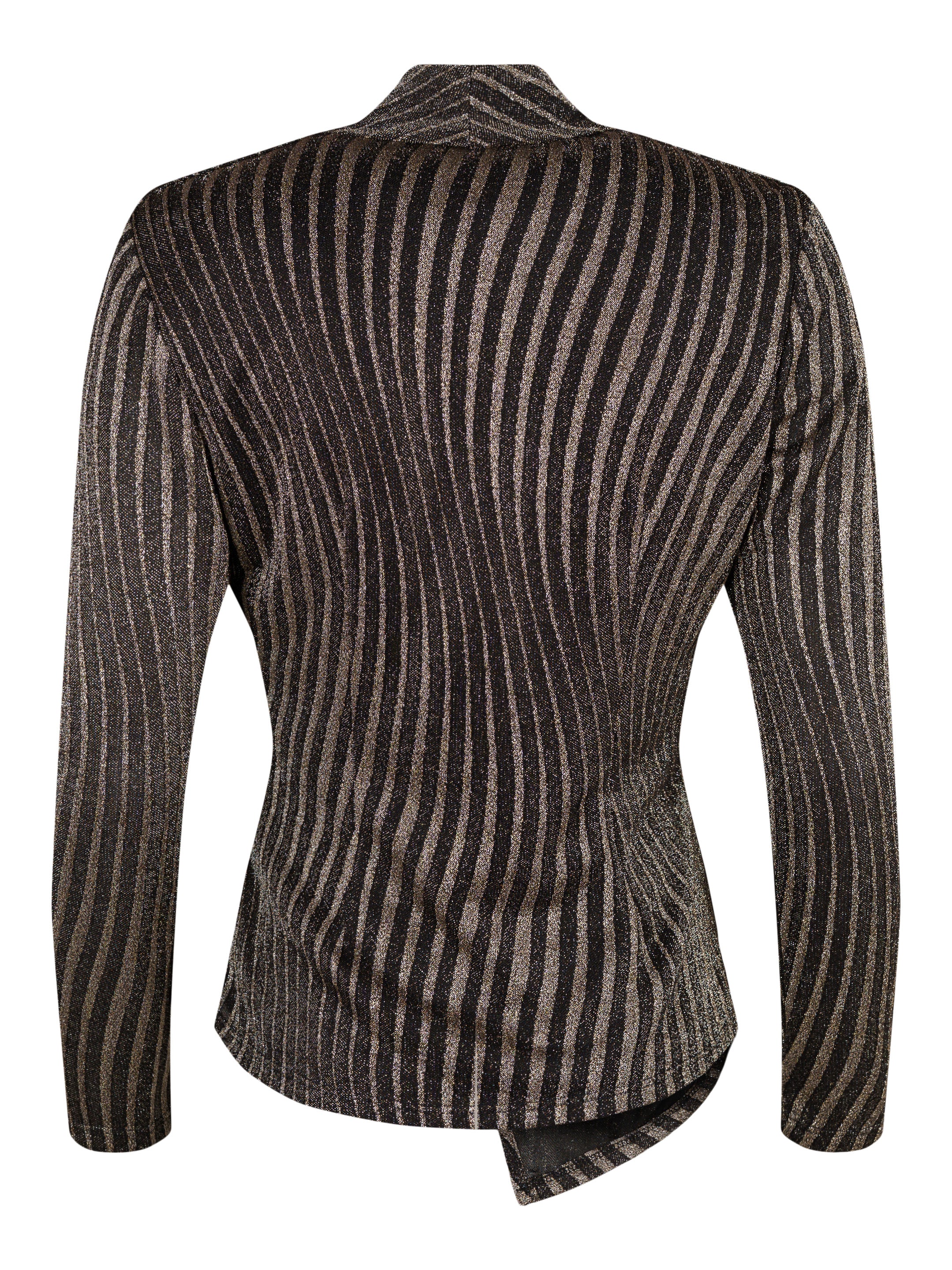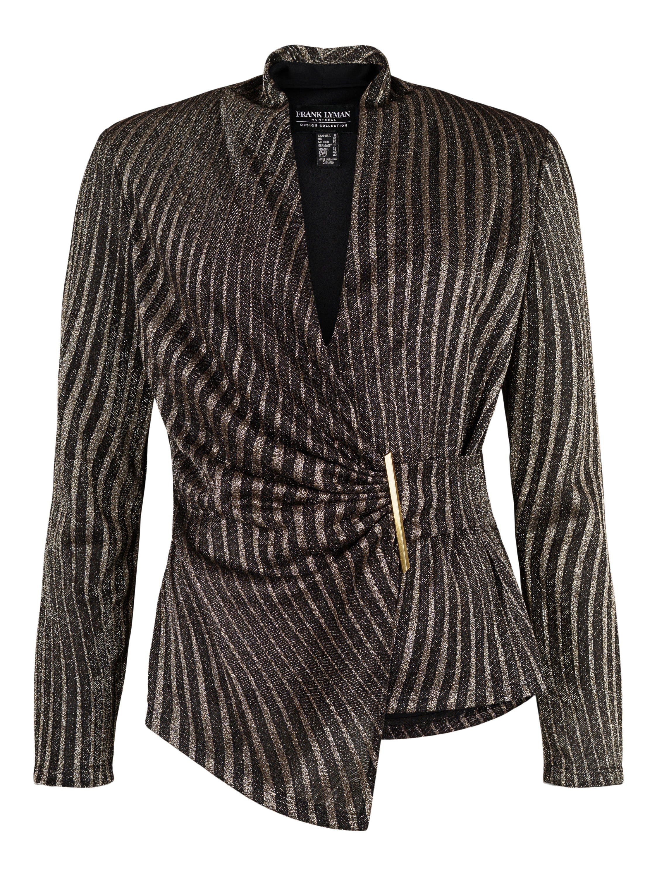 - V-halsringning i omlott med guldfärgad metalldetalj.