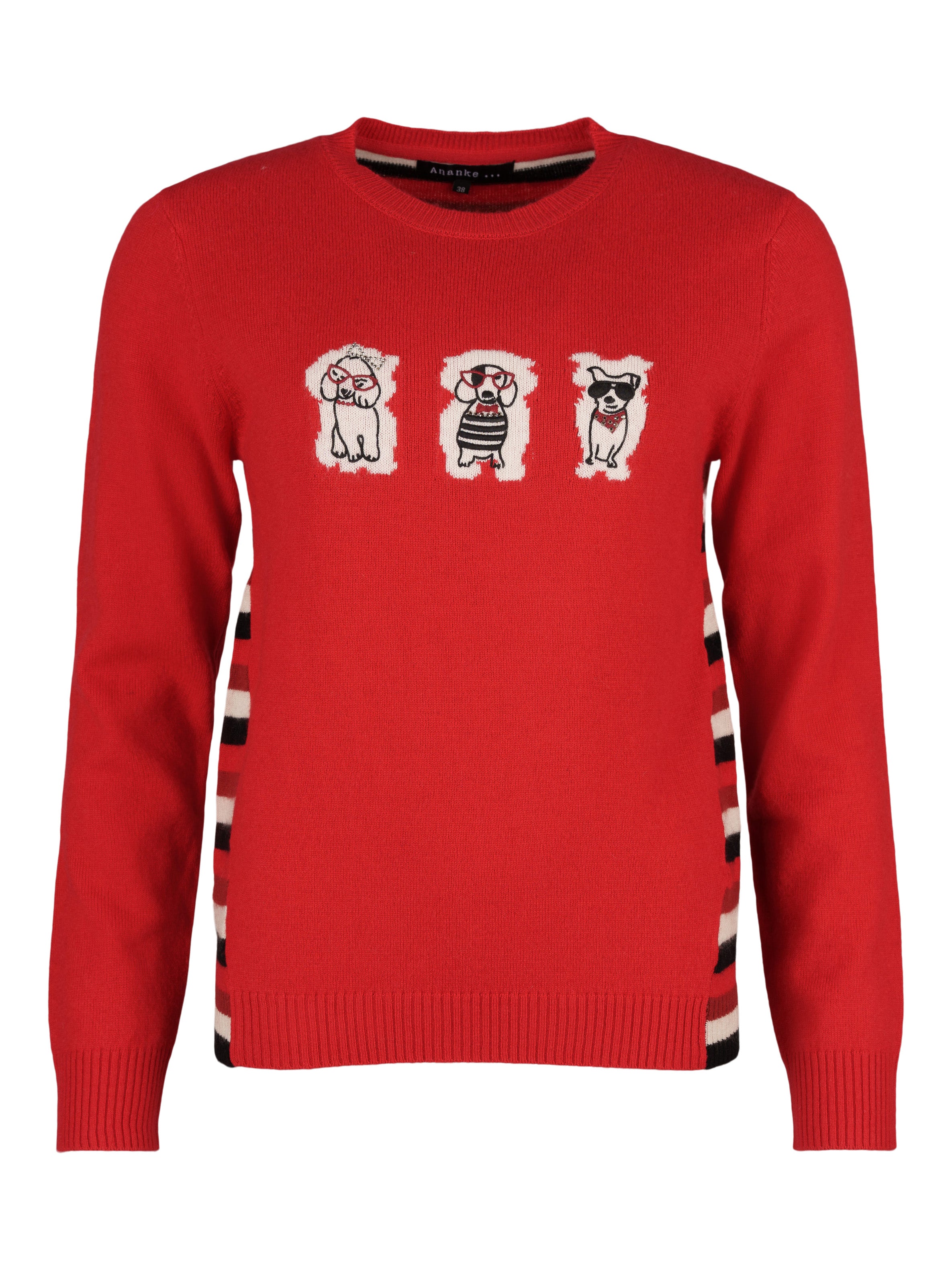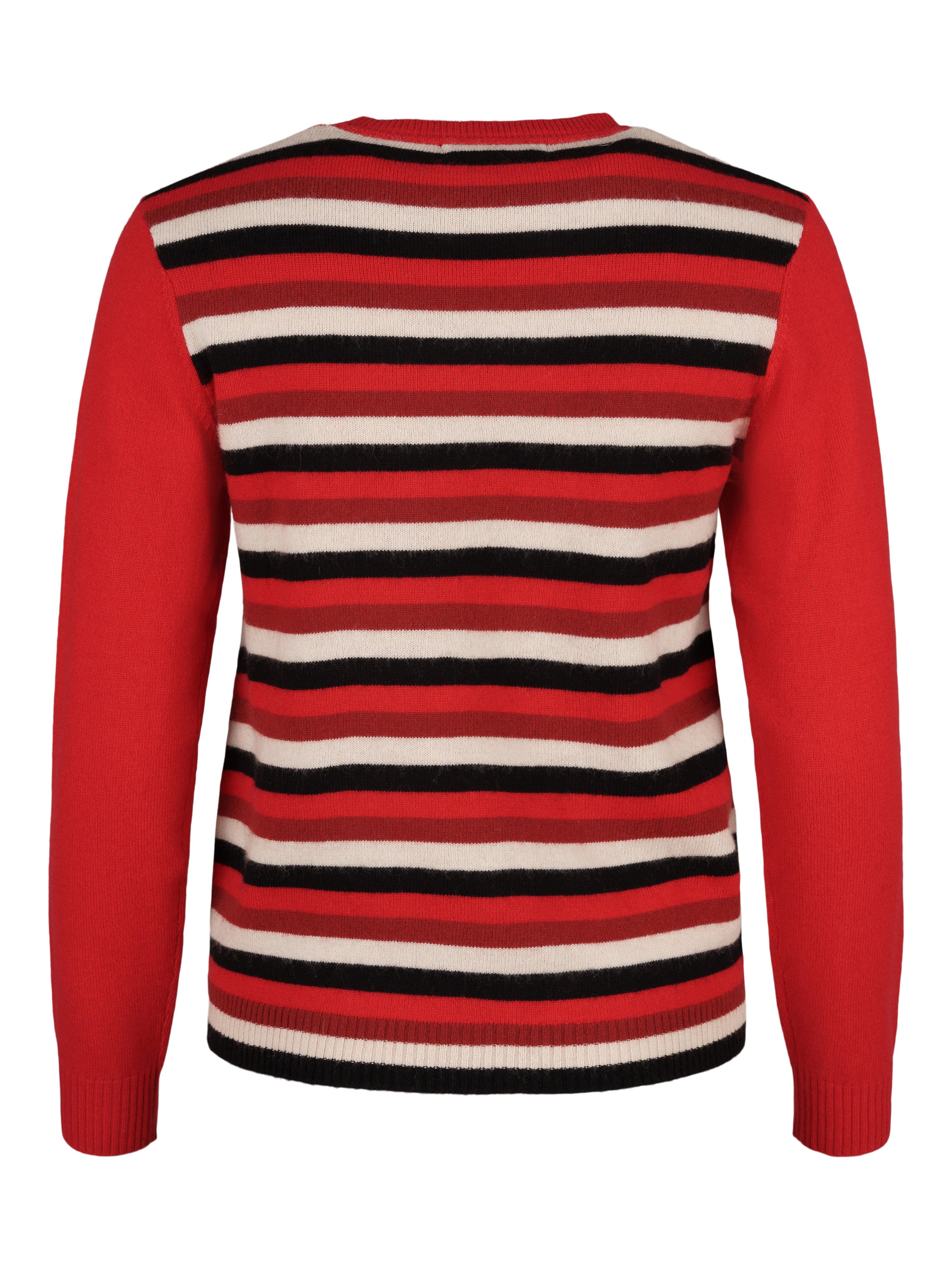 - Finstickad tröja i röd ton med randigt mönster baktill.