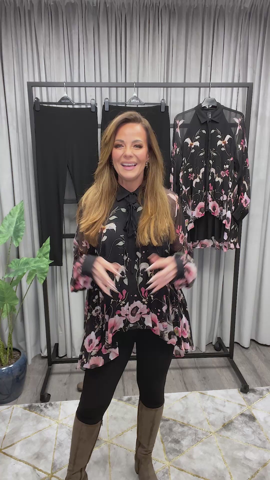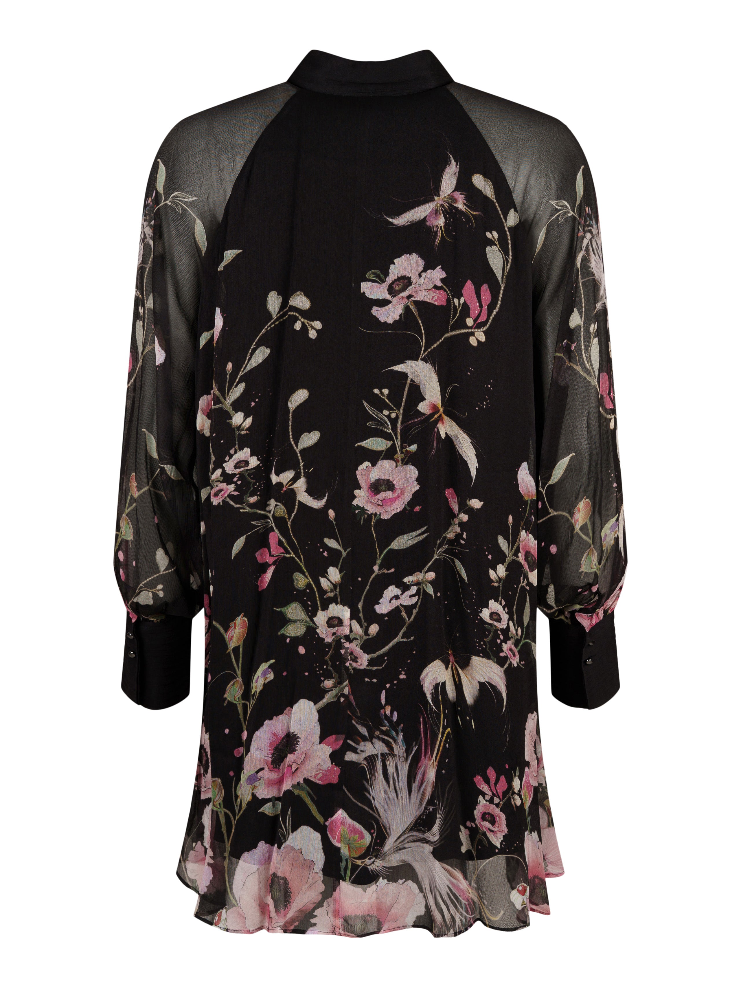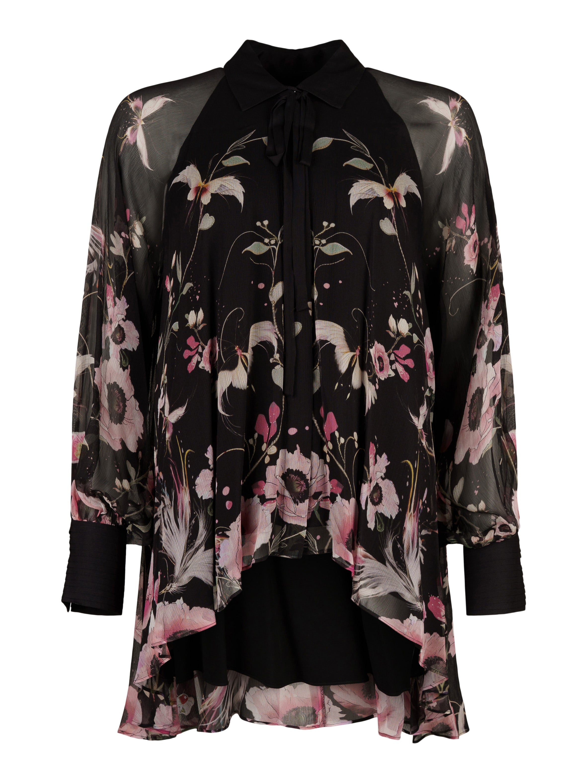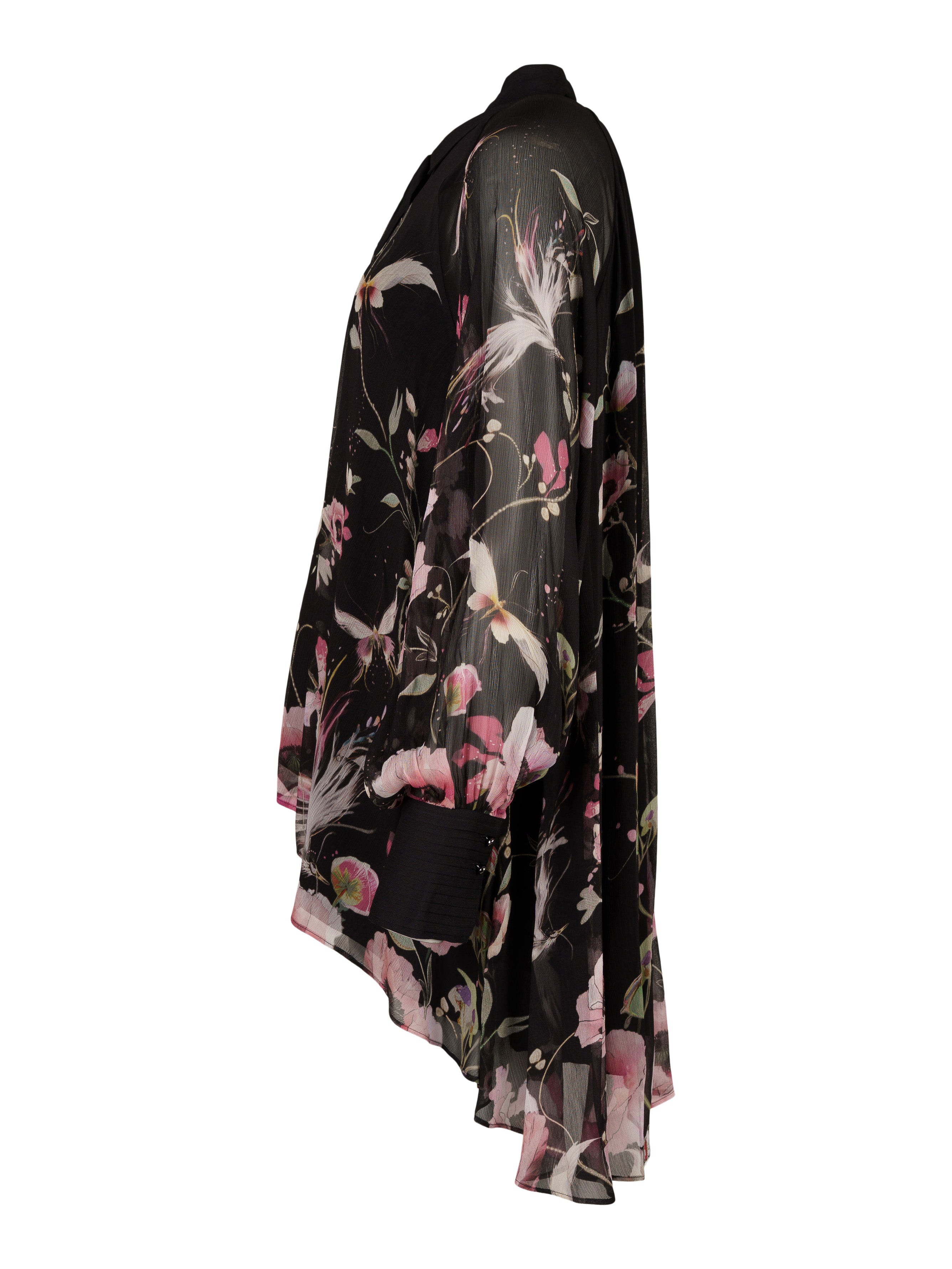 - Svart chiffong med blommigt mönster.