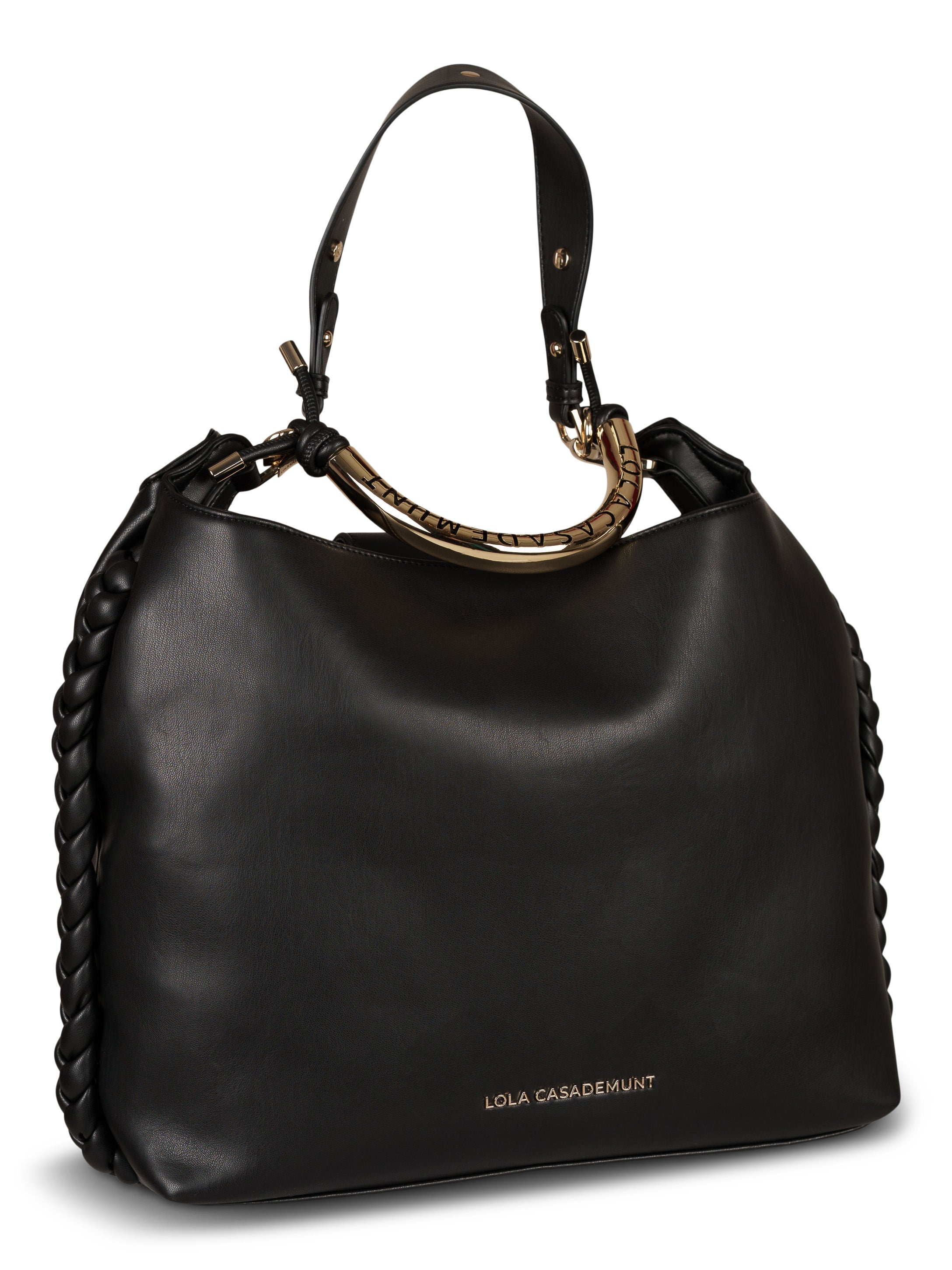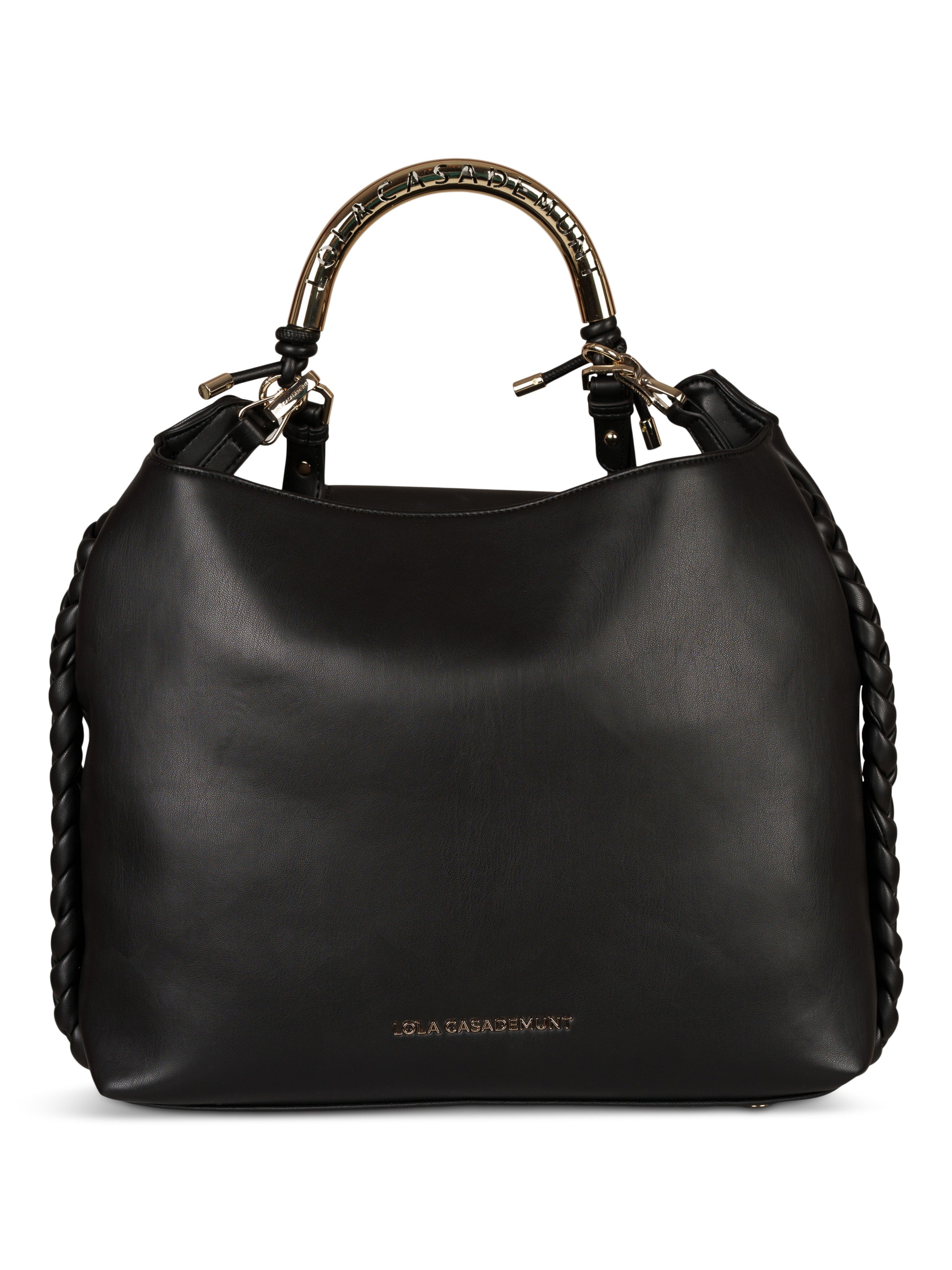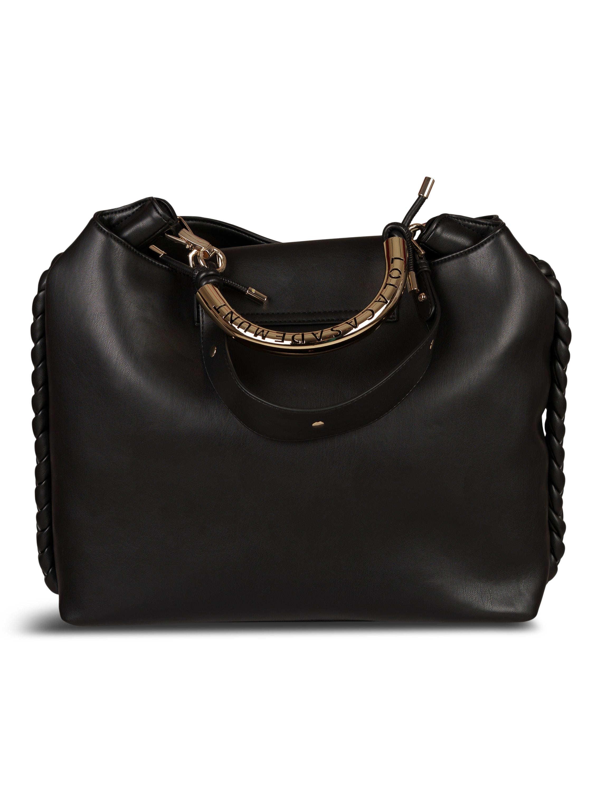 - Avtagbart kortare handtag i skinnimitation med guldfärgade nitar.